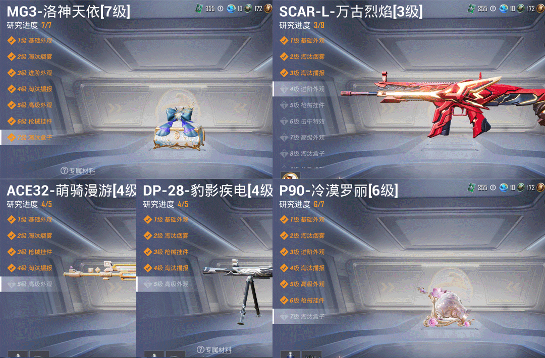 DP-28-豹影疾电/4级,,P90-冷漠罗丽/6级,,ACE32-萌骑漫游/4级,,