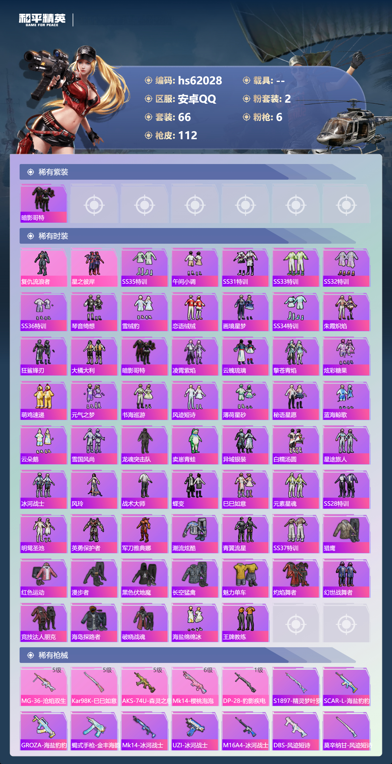 hs62028 安卓手Q-3王牌印记-2粉装-6特效枪-30314热力值-66套装-112枪皮-2卓越印记-1传奇印记