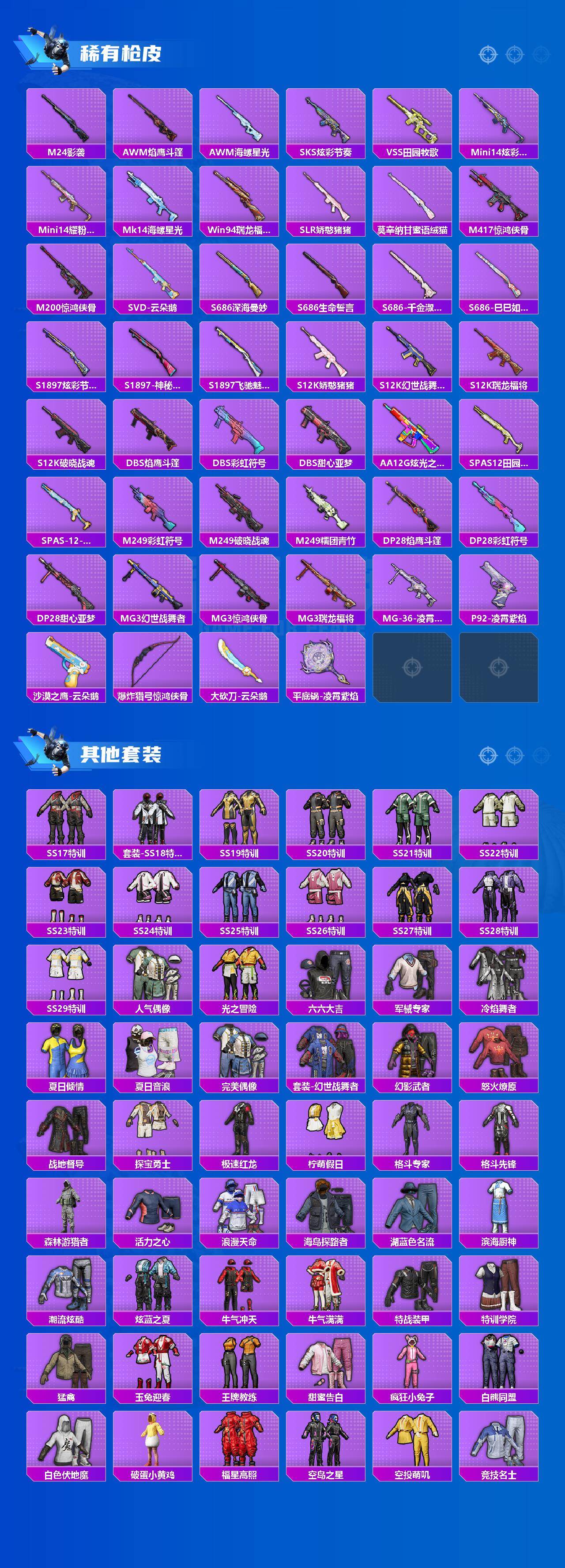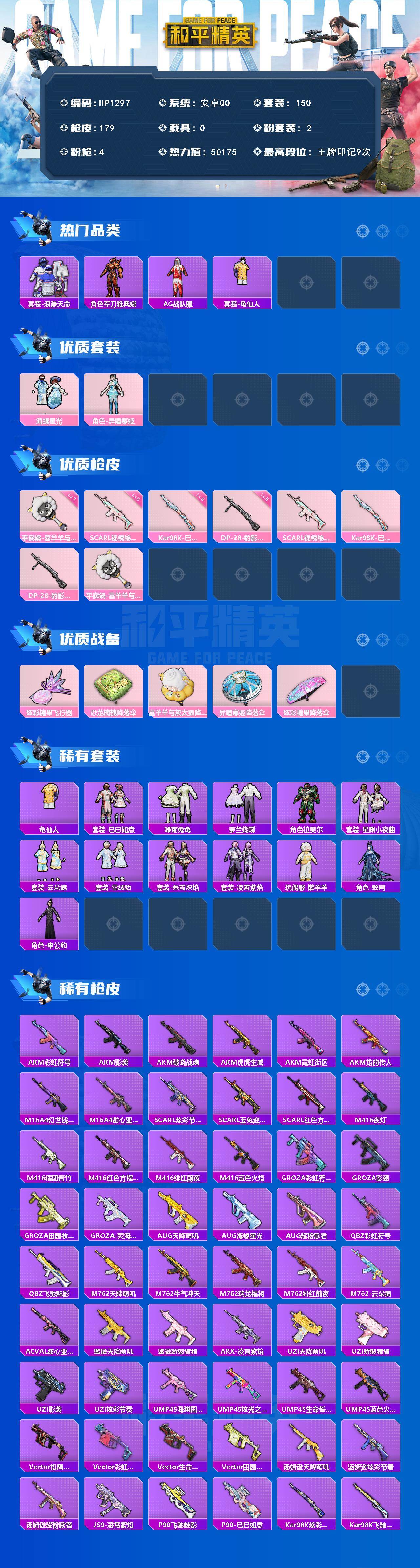 【HP1297】150套装/枪械4/装备178/战备114/王牌印记9/热力值50175/五级SCAR-L-锦绣绵绵/五级Kar98K-巳巳如意/五级DP-28-豹影疾电/七级平底锅-喜羊羊与灰太狼/套装-浪漫天命/角色-军刀雅典娜/套装-AG战队服/套装-龟仙人/粉装-海螺星光/角色-异瞳寒姬/SCAR-L-锦绣绵绵/Kar98K-巳巳如意/DP-28-豹影疾电/平底锅-喜羊羊与灰太狼/炫彩糖果飞行器/恐龙拽拽降落伞/喜羊羊与灰太狼降落伞/异瞳寒姬降落伞/炫彩糖果降落伞/套装-巳巳如意/套装-