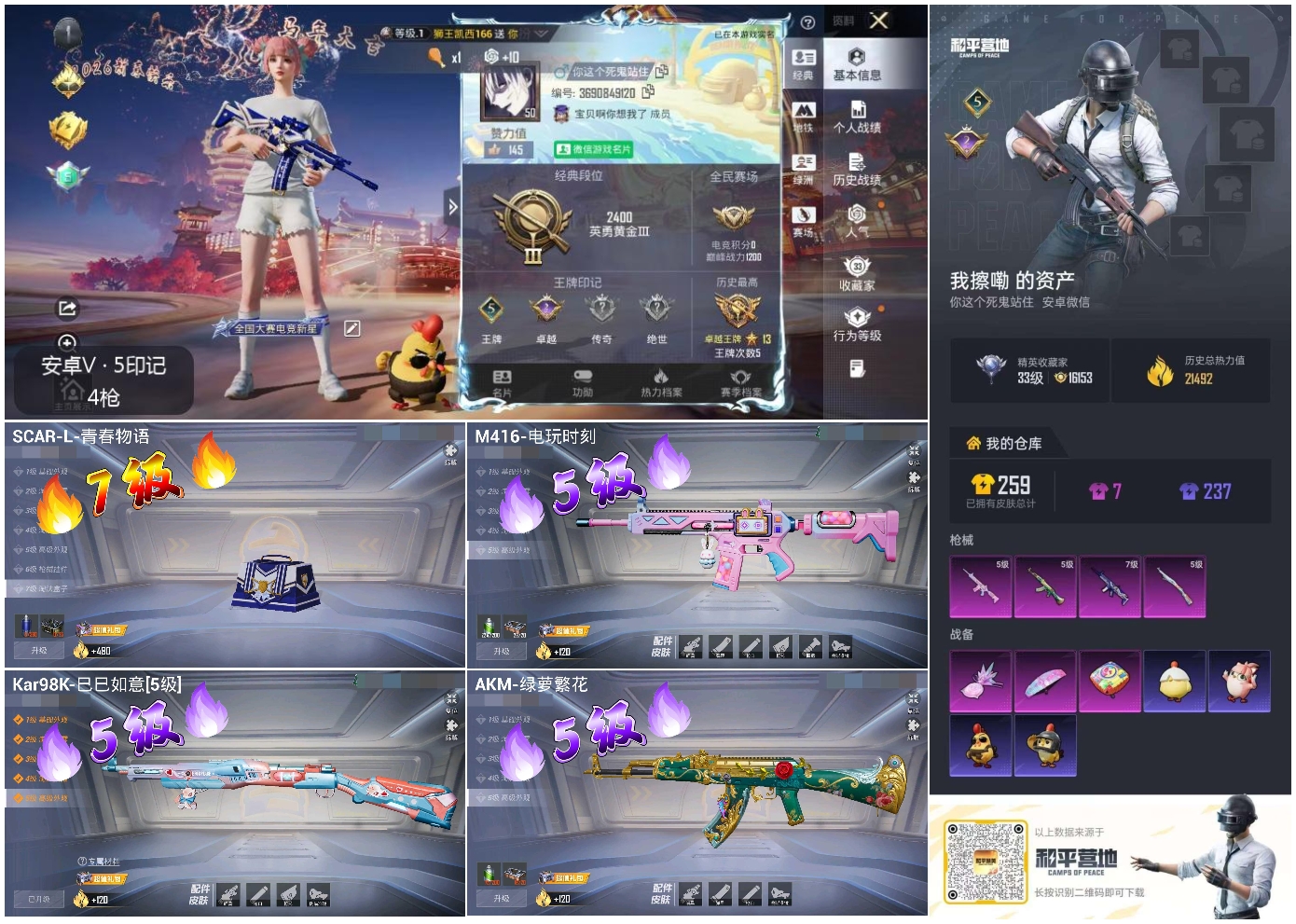 【4特效枪】AKM-绿萝繁花/5级,SCAR-L-青春物语/7级,Kar98K-巳巳如意/5级,M416-电玩时刻/5级