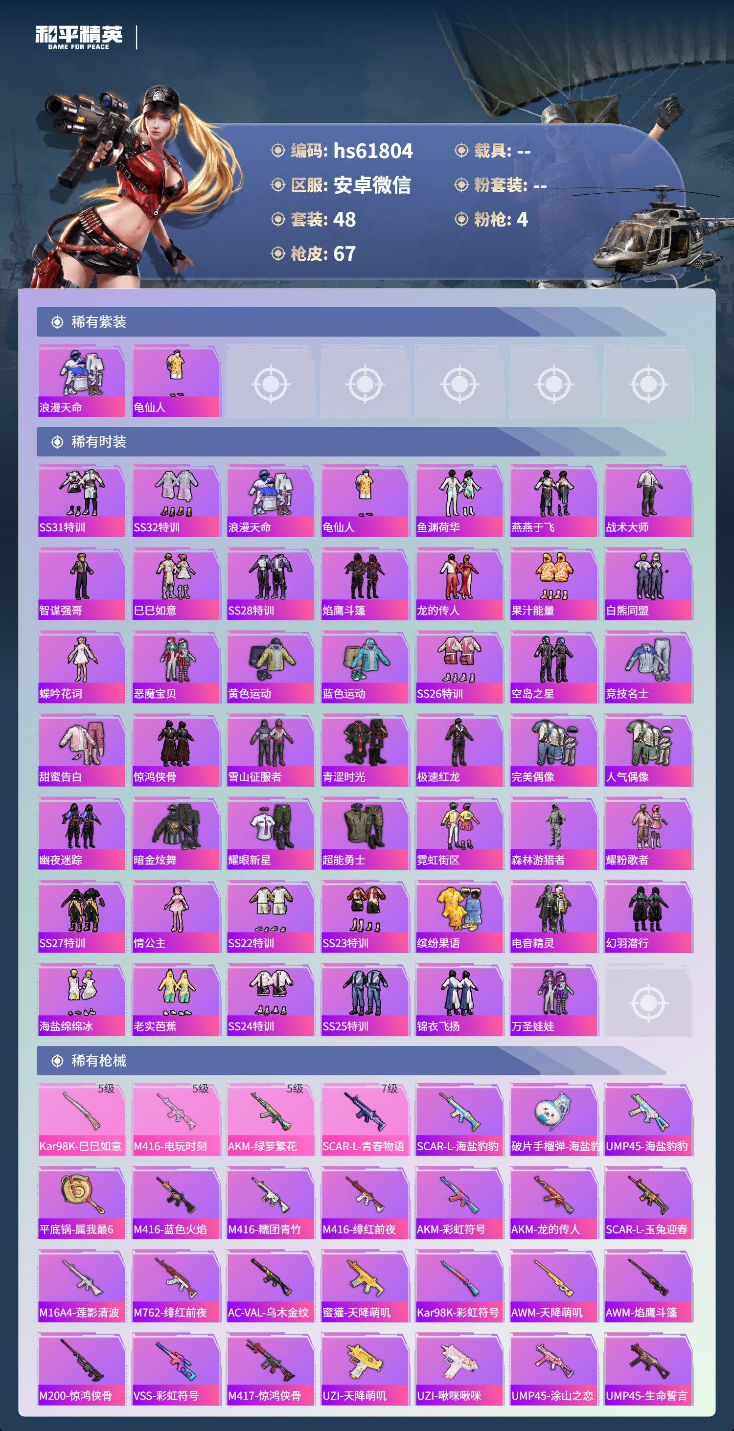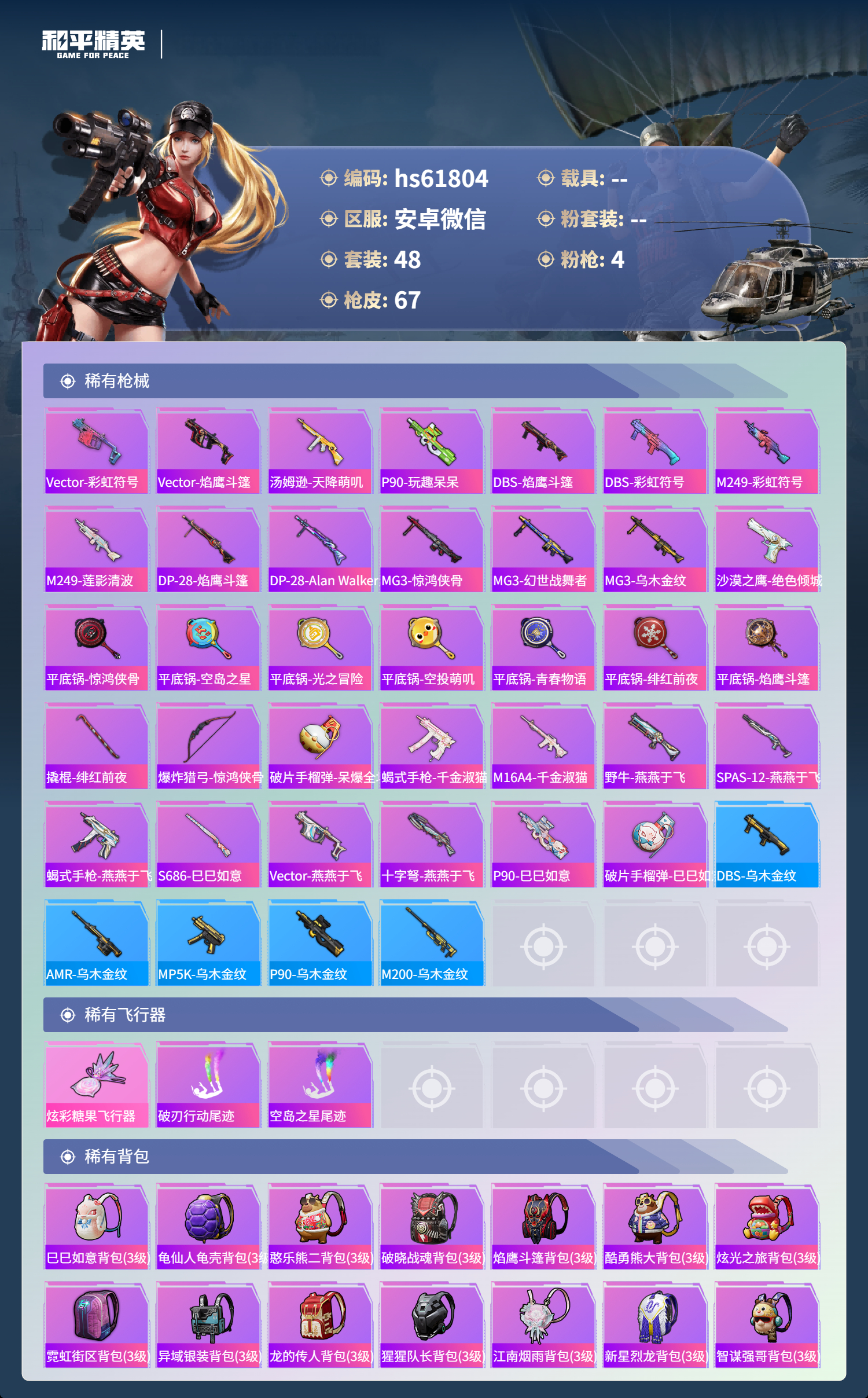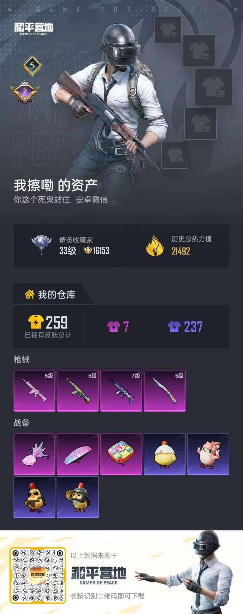 hs61804 安卓微信-5王牌印记-4特效枪-21492热力值-48套装-67枪皮-2卓越印记