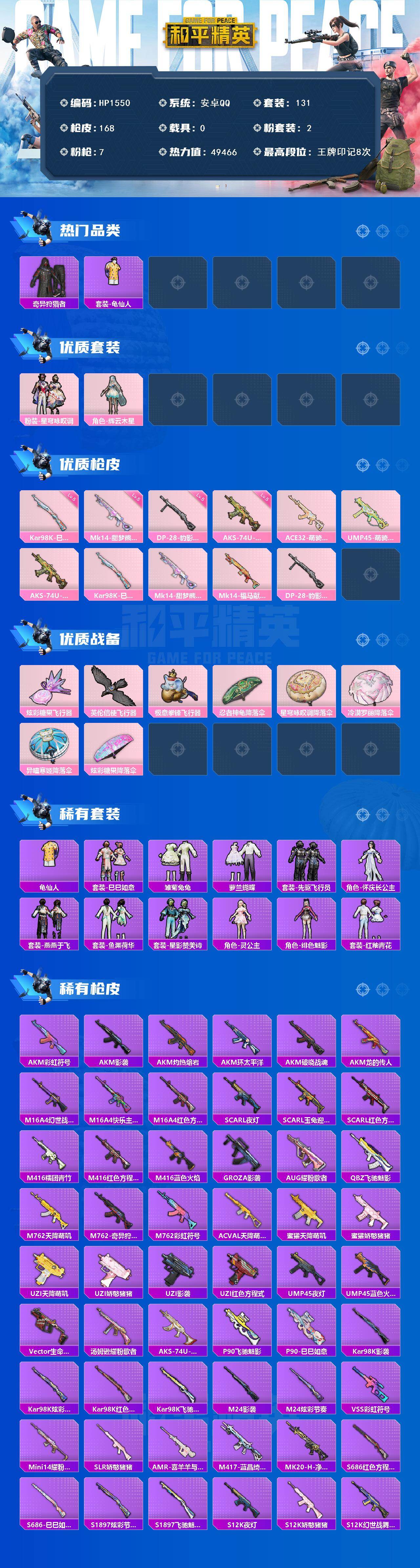 【HP1550】131套装/枪械7/装备204/战备140/王牌印记8/热力值49466/五级AKS-74U-森灵之息/五级Kar98K-巳巳如意/五级Mk14-甜梦熊击/五级DP-28-豹影疾电/套装-奇异狩猎者/套装-龟仙人/粉装-星穹咏叹调/角色-辉云木星/ACE32-萌骑漫游/UMP45-萌骑冒险/AKS-74U-森灵之息/Kar98K-巳巳如意/Mk14-甜梦熊击/Mk14-福马献瑞/DP-28-豹影疾电/炫彩糖果飞行器/英伦信使飞行器/极意拳锋飞行器/忍者神龟降落伞/星穹咏叹调降落伞