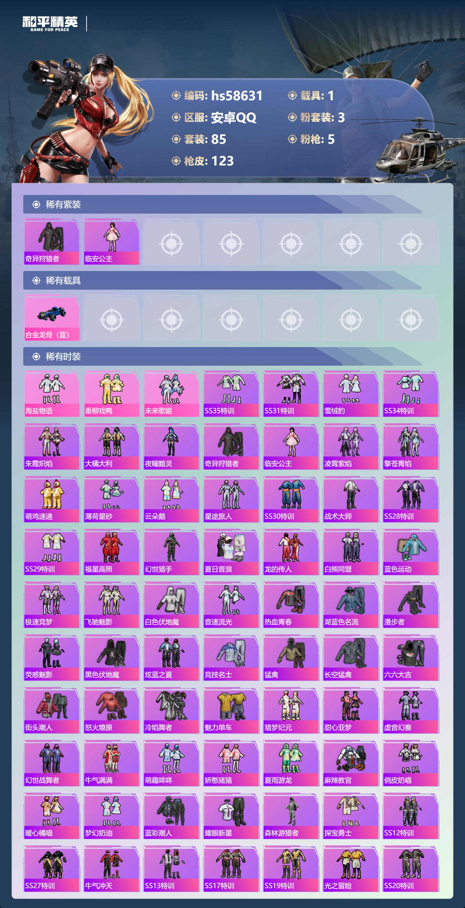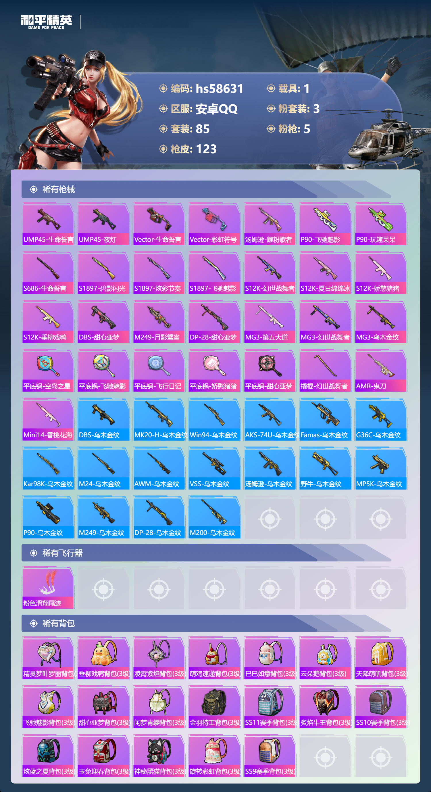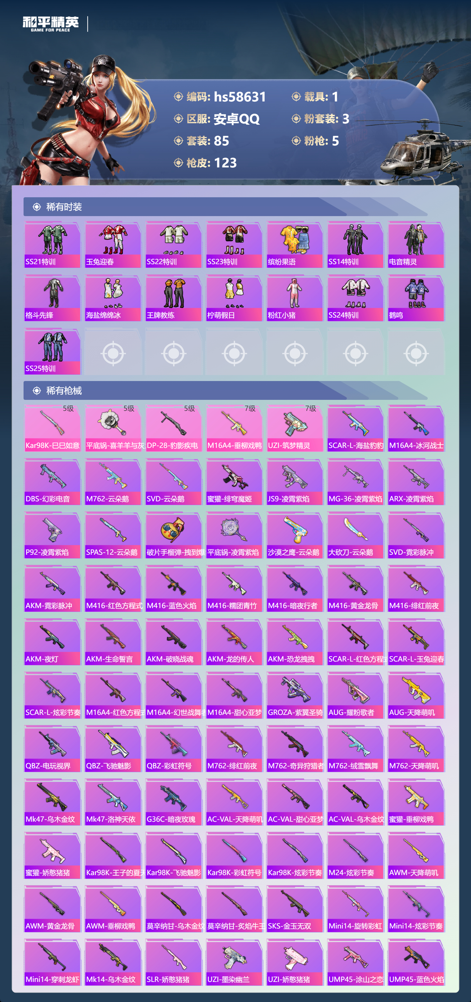 hs58631 安卓手Q-4王牌印记-3粉装-5特效枪-1载具-42087热力值-85套装-123枪皮-1卓越印记