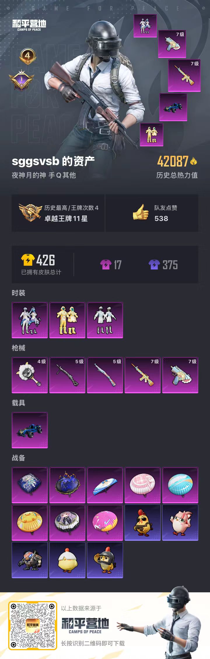 4王牌印记-3粉装-5特效枪-1载具-42087热力值-85套装-123枪皮-1卓越印记
