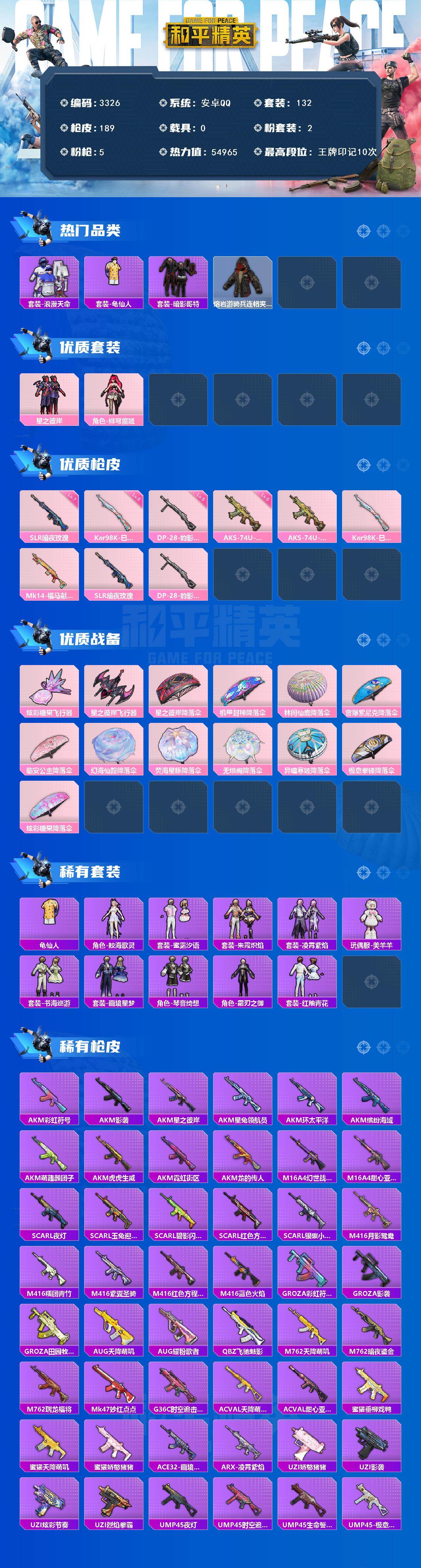 安卓 手Q-2粉装-5特效枪-0载具-2粉色飞行器-54965热力值-10王牌印记-132套装-189枪皮