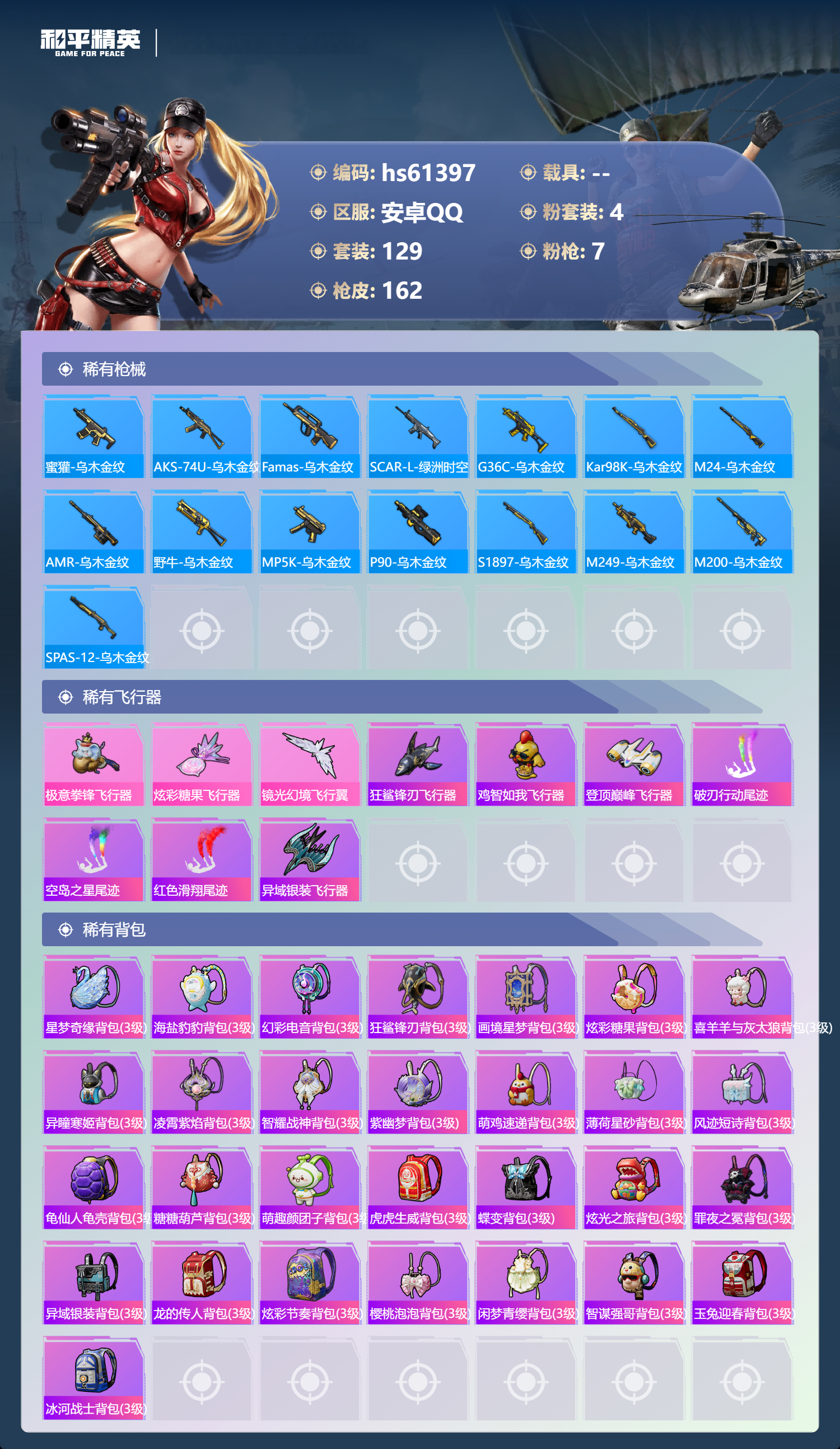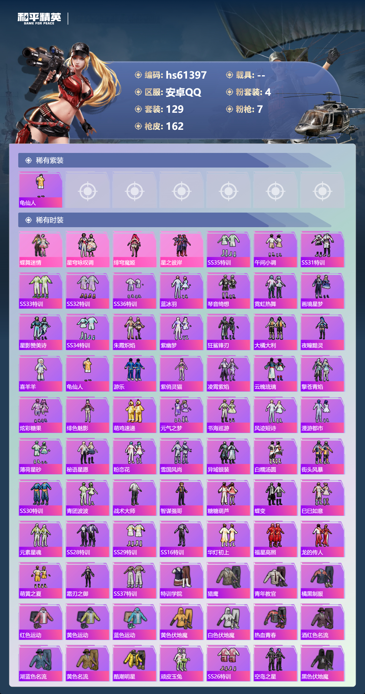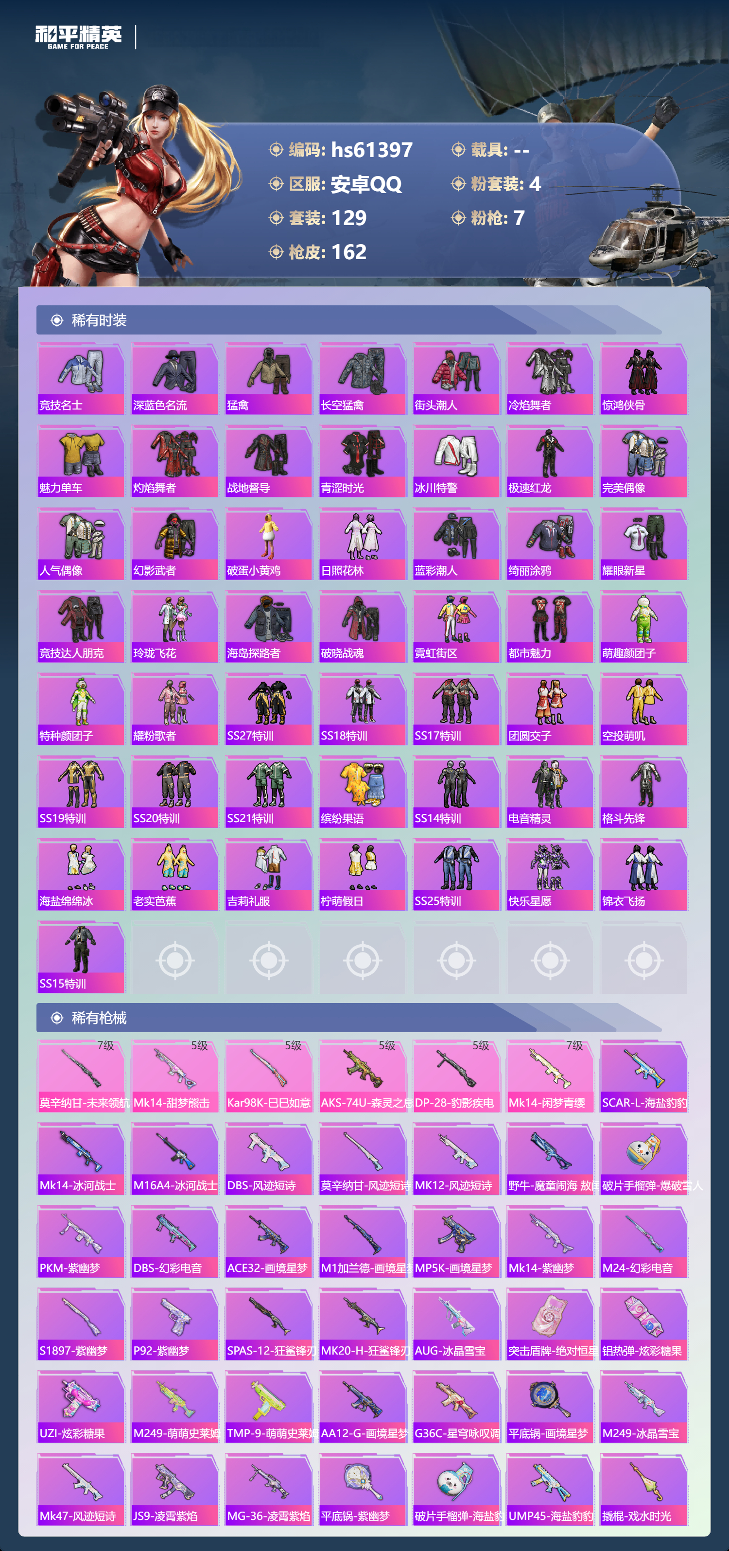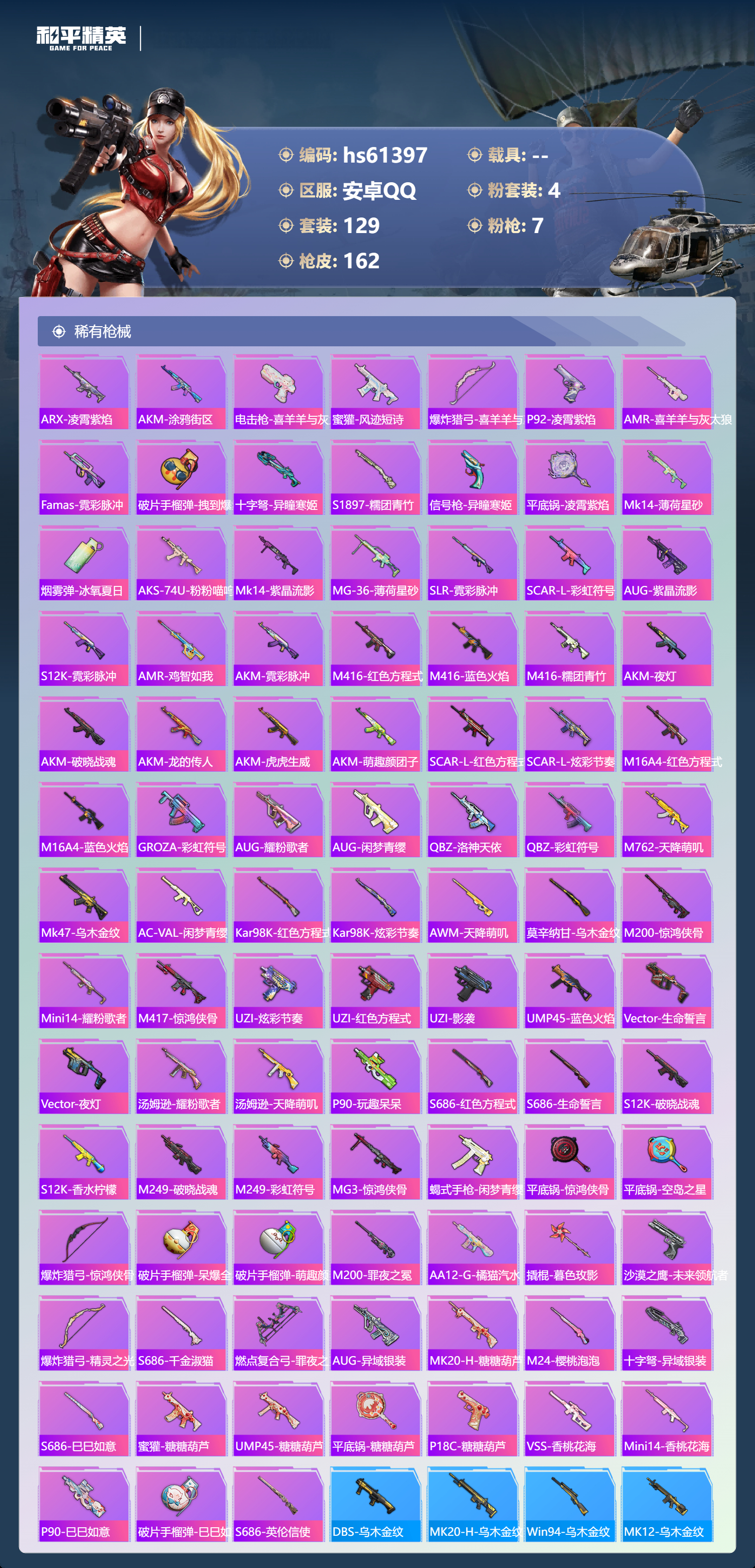 hs61397 安卓手Q-9王牌印记-4粉装-7特效枪-53172热力值-129套装-162枪皮-3卓越印记-3传奇印记