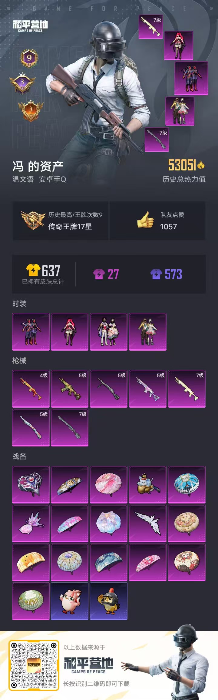 9王牌印记-4粉装-7特效枪-53172热力值-129套装-162枪皮-3卓越印记-3传奇印记