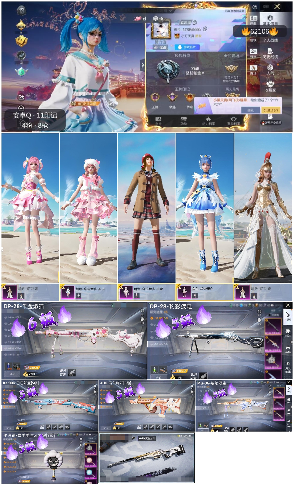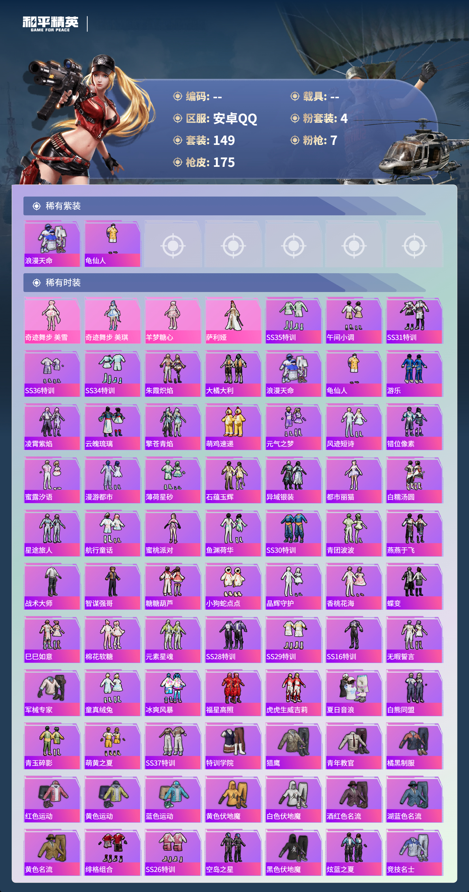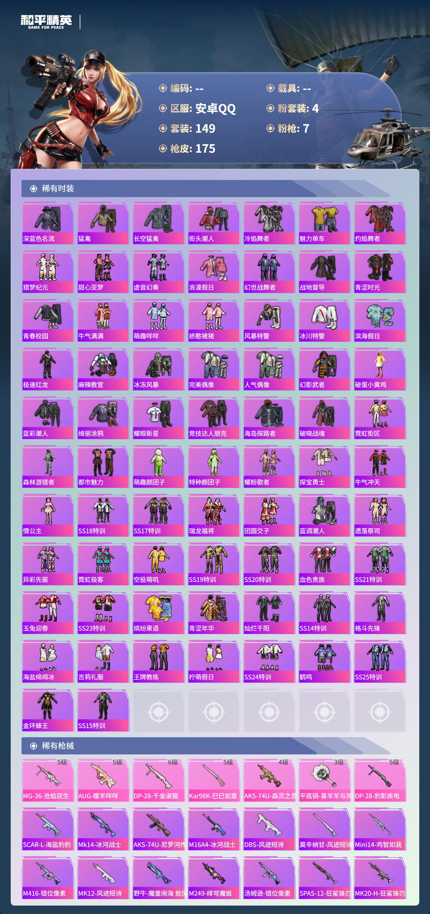 hs62106 安卓手Q-11王牌印记-4粉装-7特效枪-54664热力值-149套装-175枪皮-4卓越印记-1传奇印记