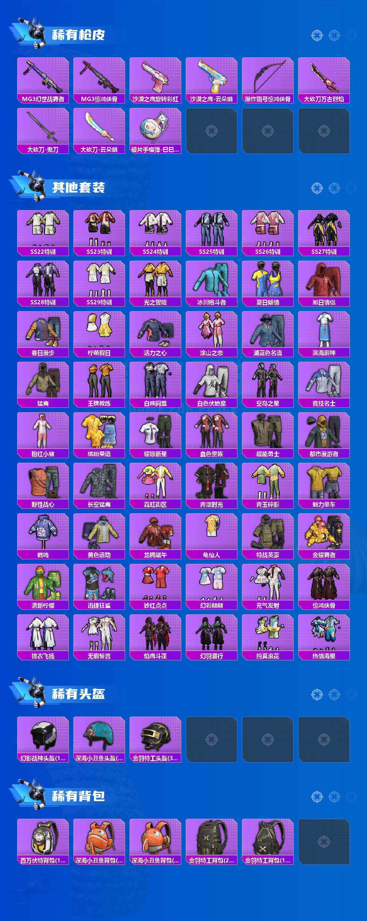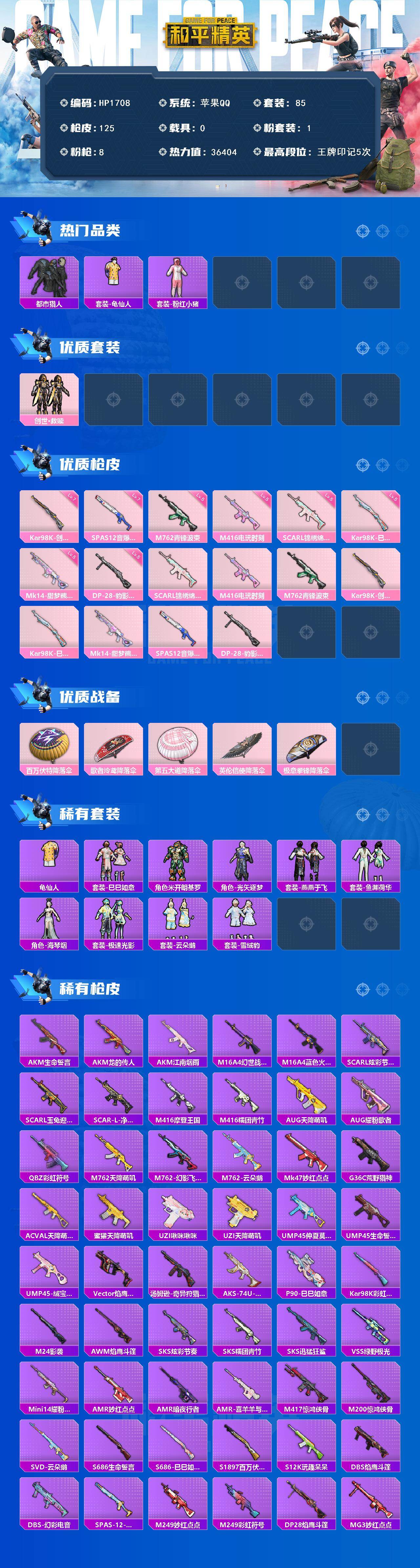 【HP1708】85套装/枪械8/装备131/战备81/王牌印记5/热力值36404/五级SCAR-L-锦绣绵绵/五级M416-电玩时刻/五级M762-青锋波束/七级Kar98K-创世·救赎/五级Kar98K-巳巳如意/五级Mk14-甜梦熊击/七级SPAS-12-音爆索尼克/五级DP-28-豹影疾电/套装-都市猎人/套装-龟仙人/套装-粉红小猪/套装-创世·救赎/SCAR-L-锦绣绵绵/M416-电玩时刻/M762-青锋波束/Kar98K-创世·救赎/Kar98K-巳巳如意/Mk14-甜梦熊击/