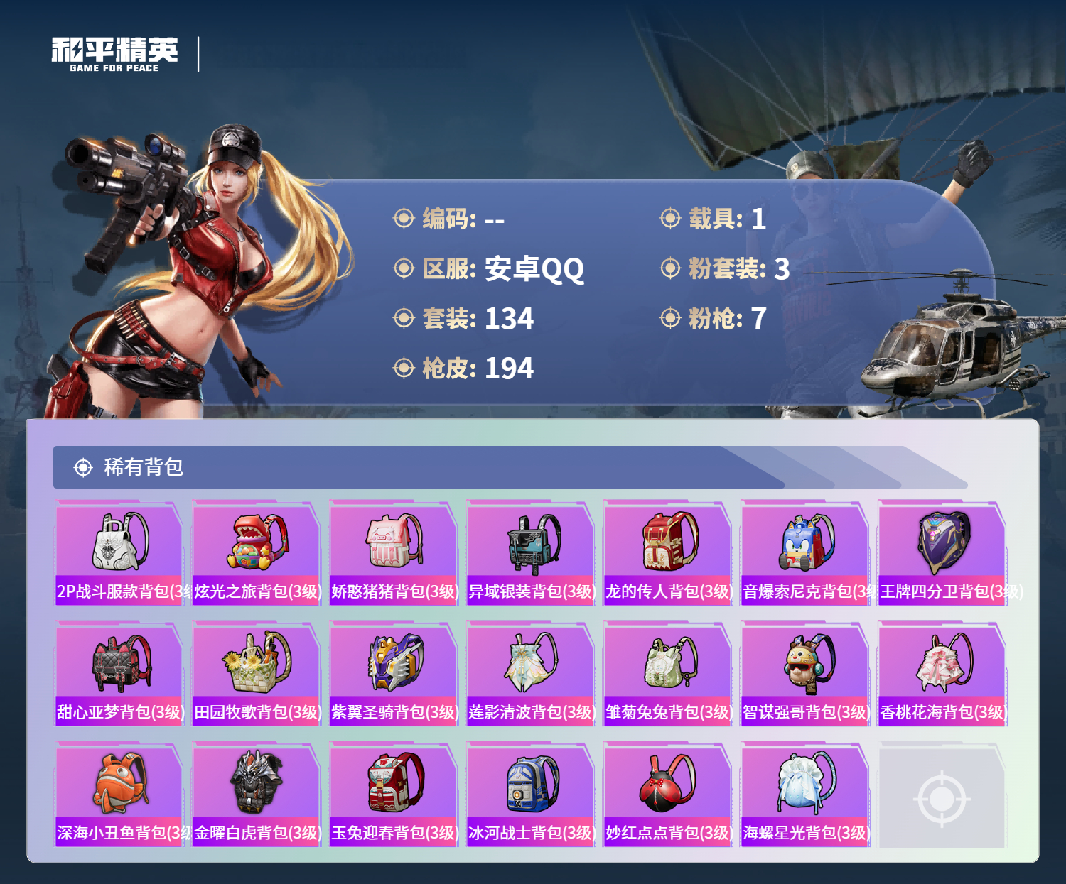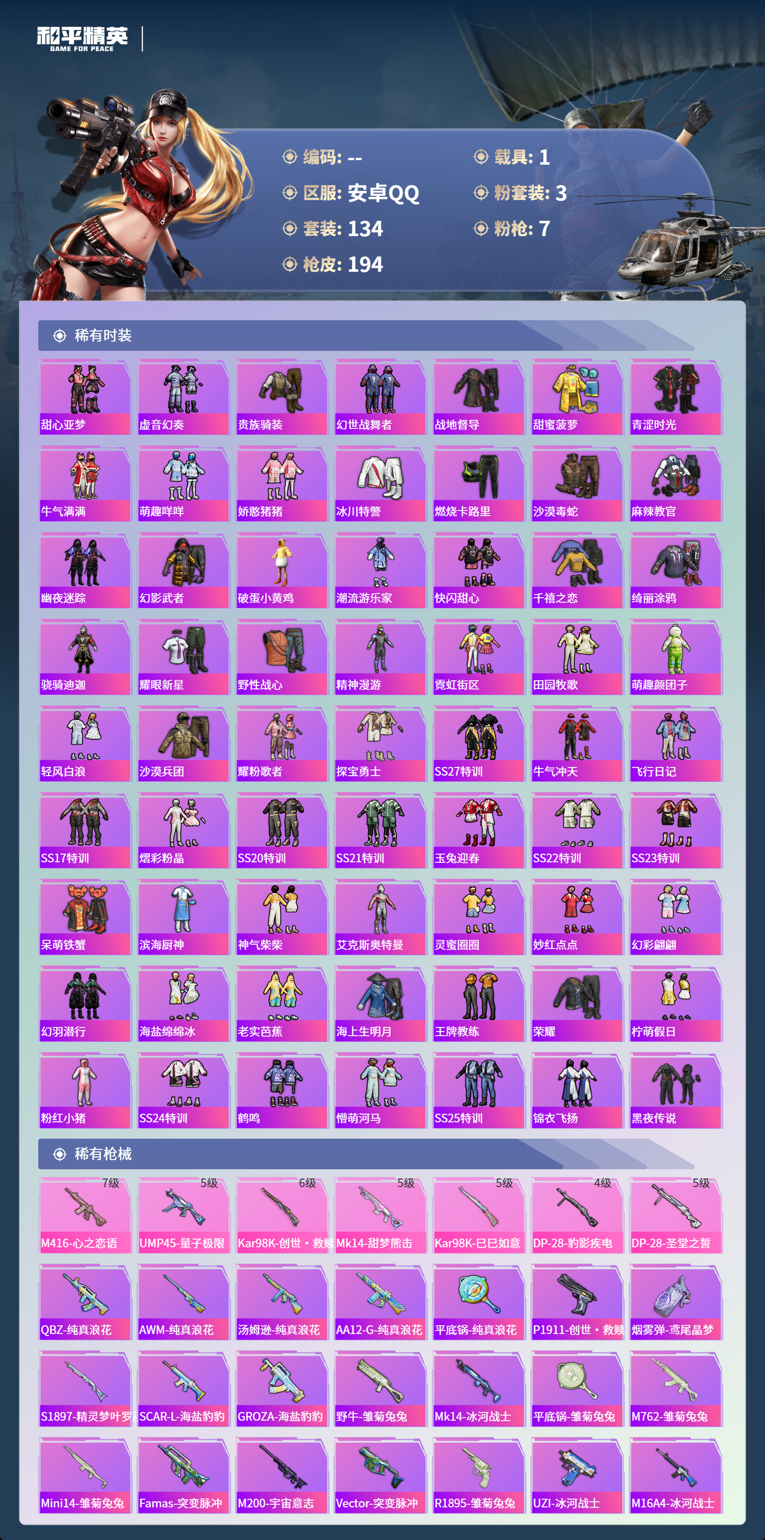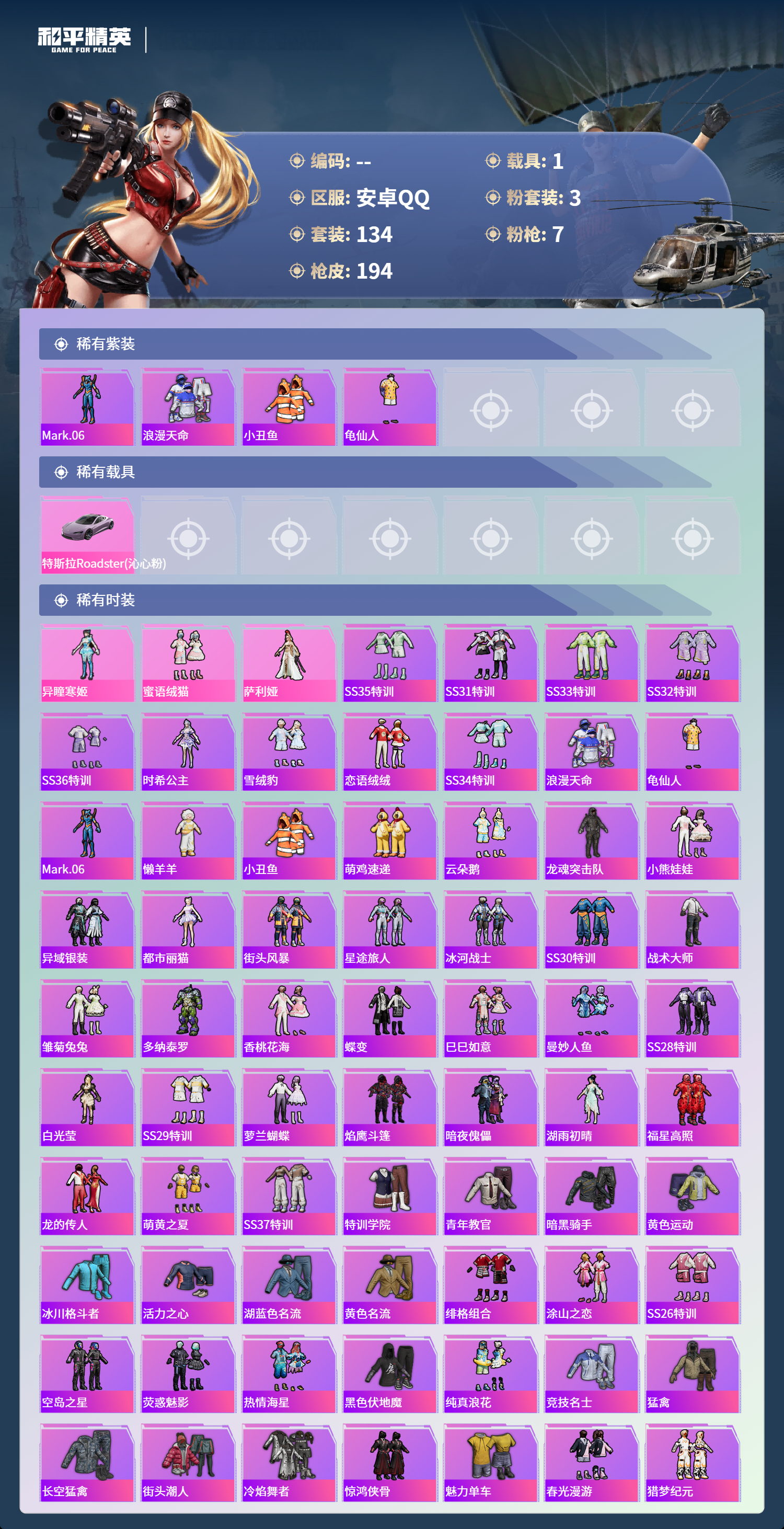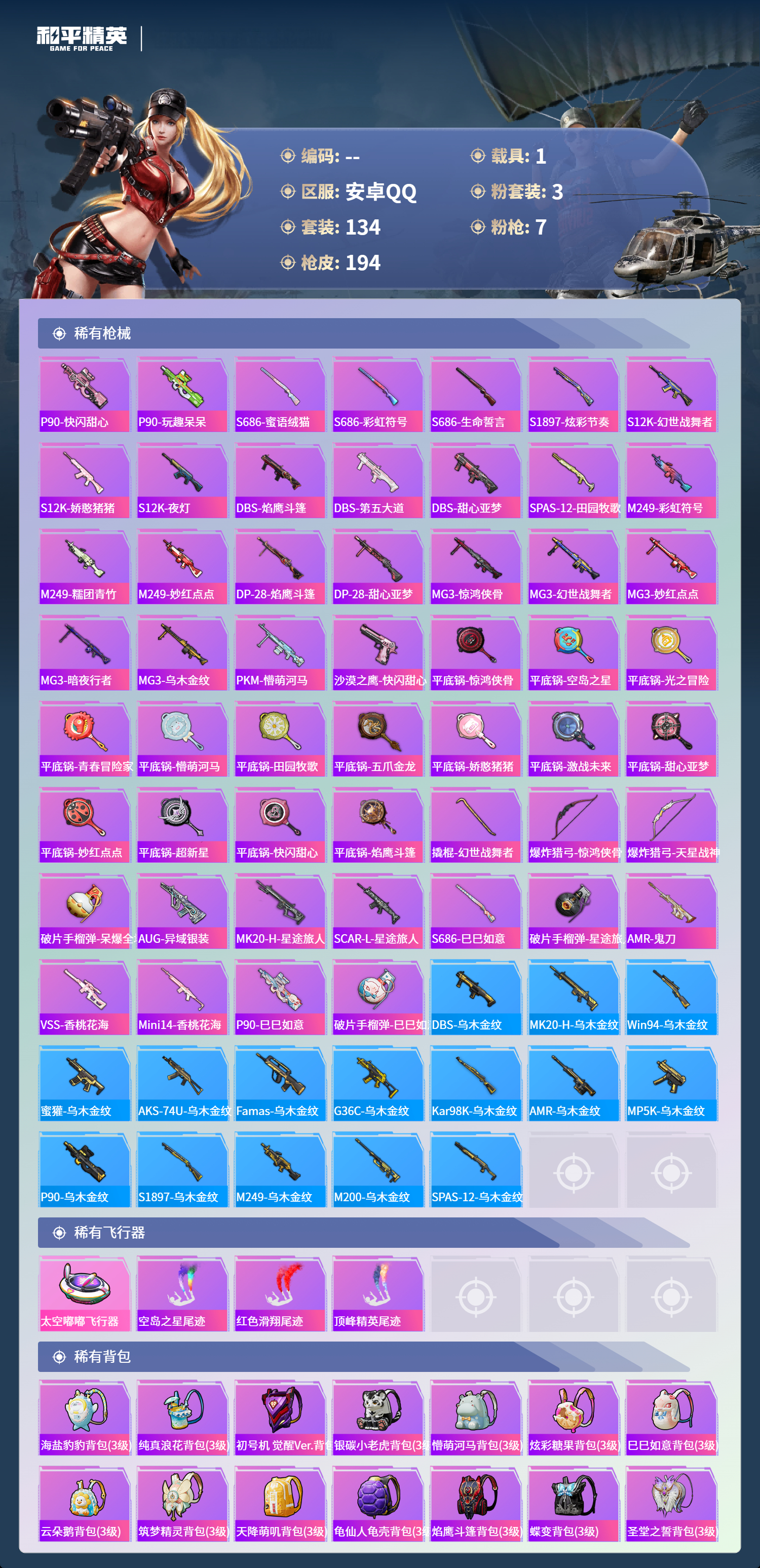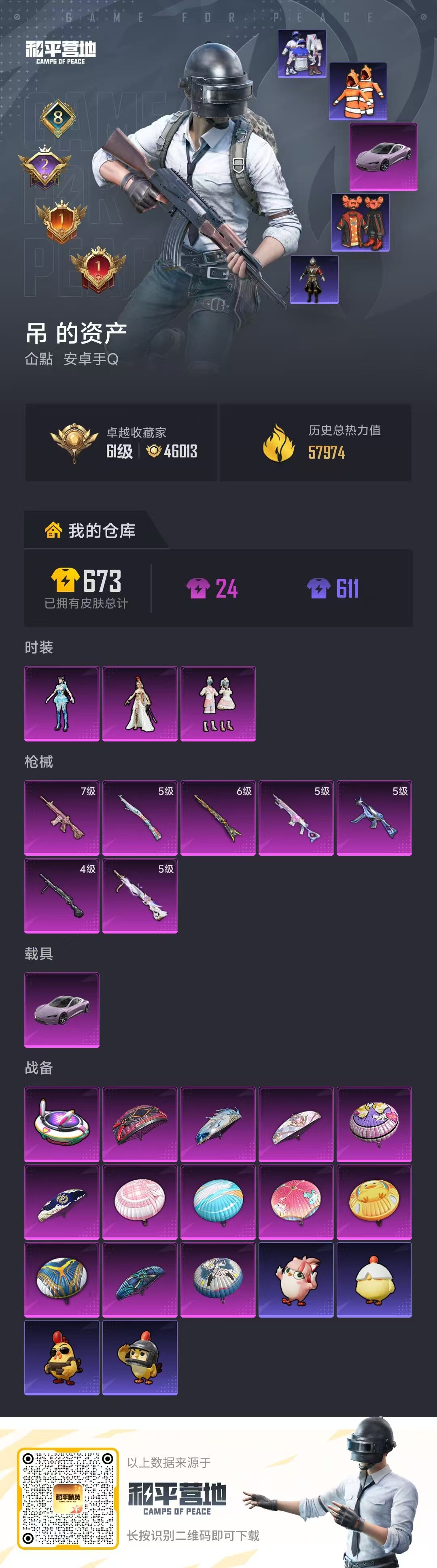 hs62239安卓手Q-8王牌印记-3粉装-7特效枪-1载具-57974热力值-134套装-194枪皮-2卓越印记-1传奇印记