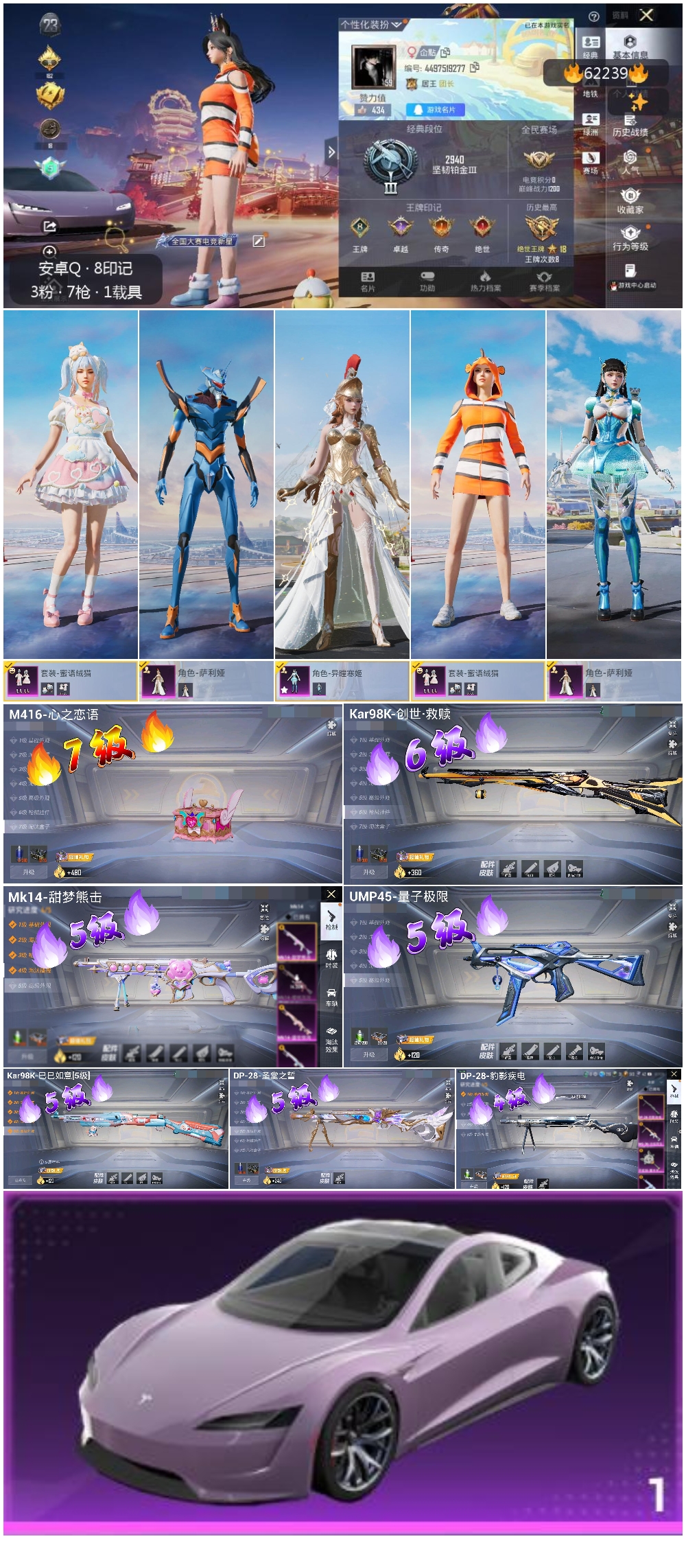 【7特效枪】UMP45-量子极限/5级,DP-28-圣堂之誓/5级,Kar98K-创世·救赎/6级,Mk14-甜梦熊击/5级,Kar98K-巳巳如意/5级,DP-28-豹影疾电/4级,M416-心之恋语/7级
