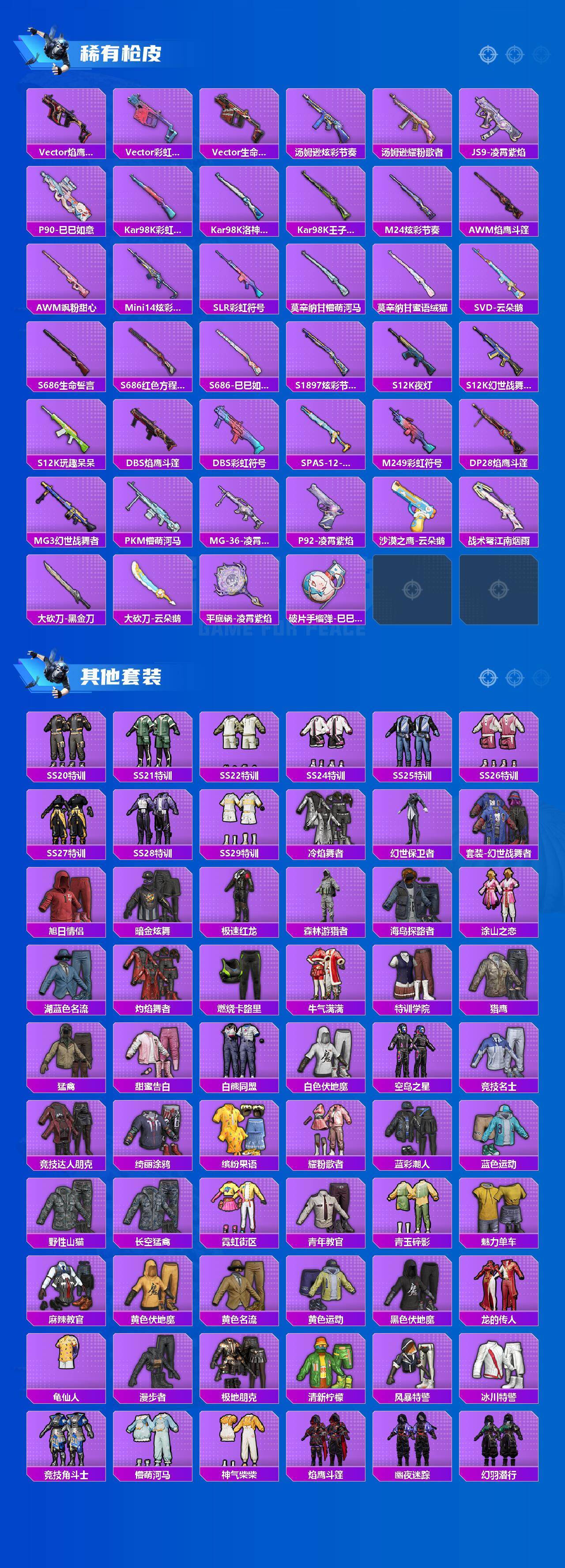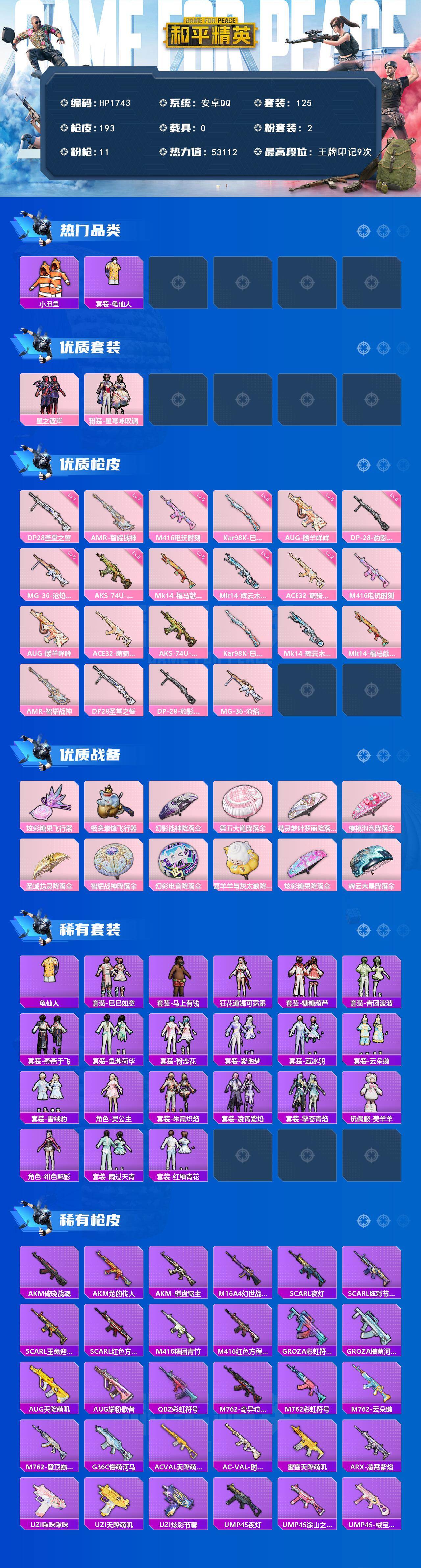 【HP1743】125套装/枪械11/装备232/战备142/王牌印记9/热力值53112/五级M416-电玩时刻/五级AUG-暖羊咩咩/二级ACE32-萌骑漫游/五级AKS-74U-森灵之息/五级Kar98K-巳巳如意/二级Mk14-辉云木星/五级Mk14-福马献瑞/七级AMR-智耀战神/七级DP-28-圣堂之誓/五级DP-28-豹影疾电/五级MG-36-沧焰双生/套装-小丑鱼/套装-龟仙人/粉装-星之彼岸/粉装-星穹咏叹调/M416-电玩时刻/AUG-暖羊咩咩/ACE32-萌骑漫游/AKS-