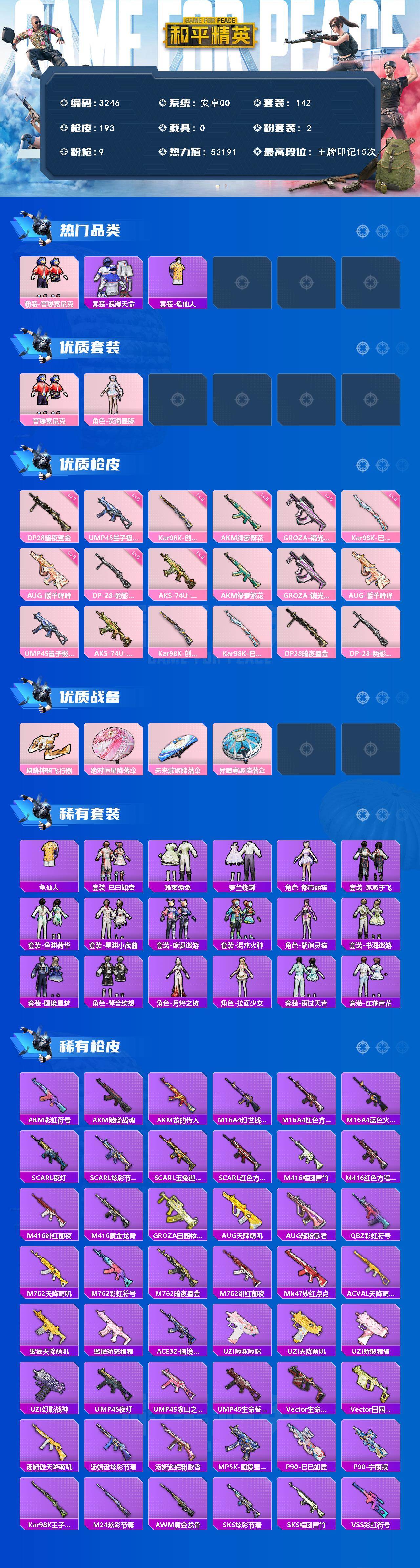 安卓 手Q-2粉装-9特效枪-0载具-2粉色飞行器-53191热力值-15王牌印记-142套装-193枪皮
