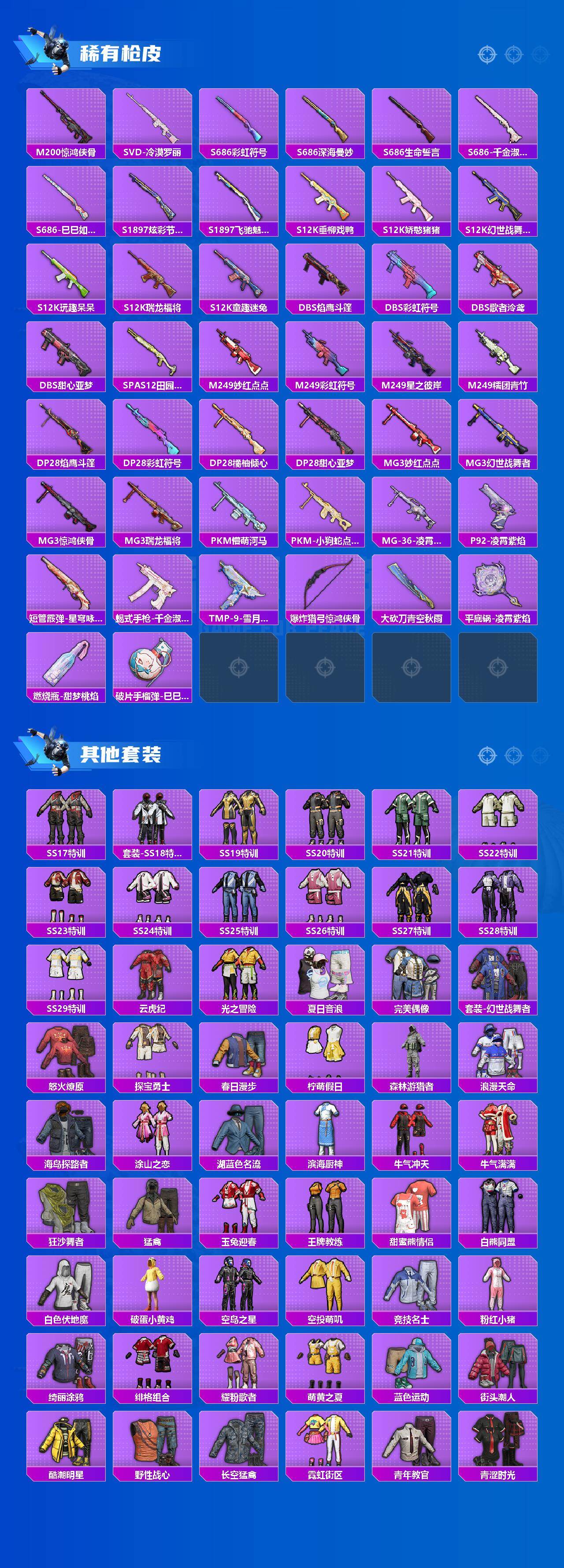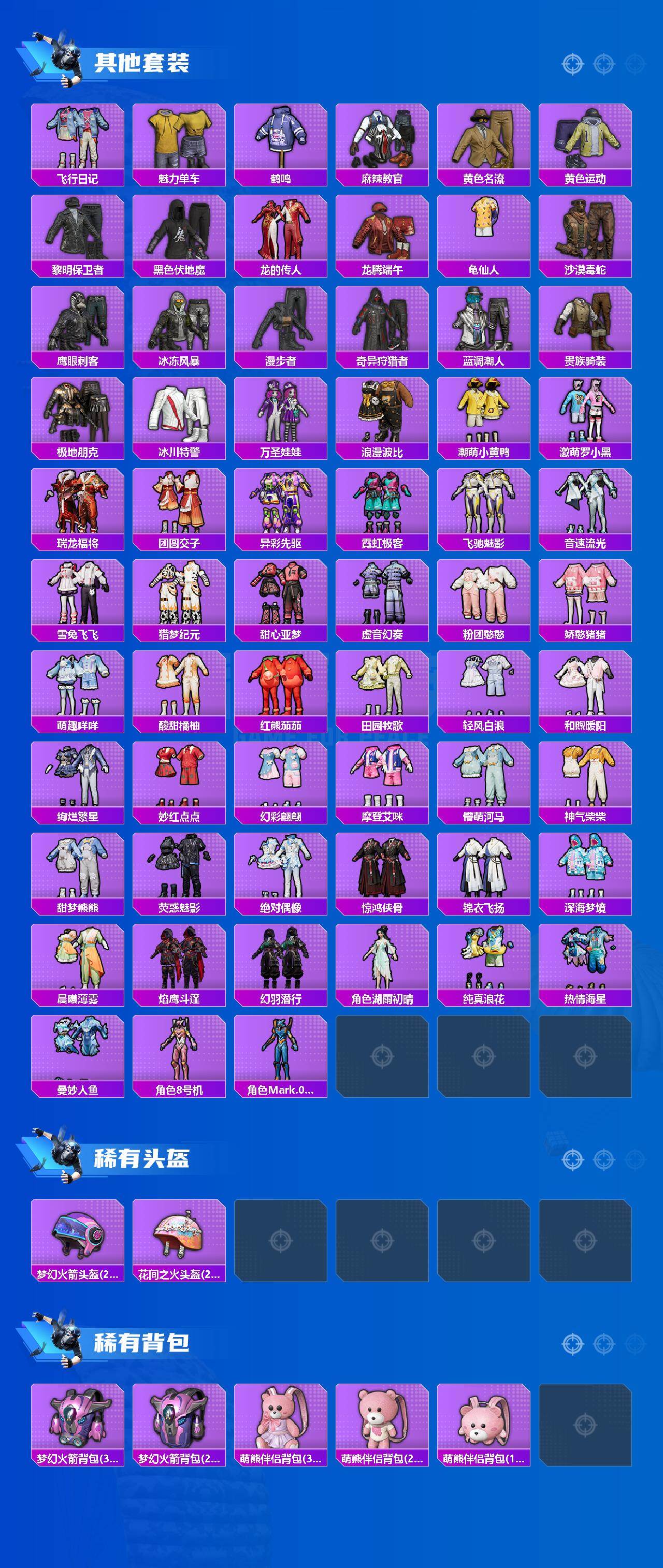 【热门品类】:粉装-梦幻火箭,粉装-童趣迷兔,粉装-缤纷油彩,套装-浪漫天命,套装-奇异狩猎者,套装-胖达圆圆,套装-金羽特工,套装-龟仙人,套装-潮萌小黄鸭,套装-浪漫波比,套装-粉红小猪,角色-8号机,角色-Mark.06,套装-红熊茄茄