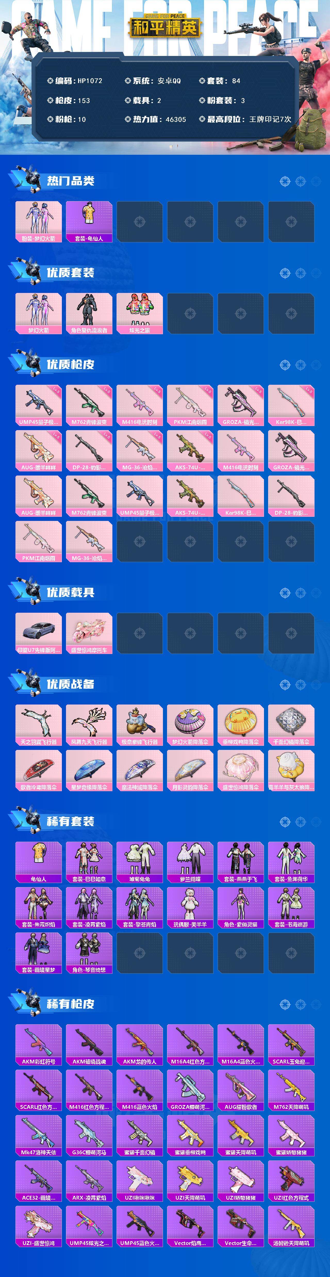 【HP1072】84套装/枪械10/装备163/载具2/战备95/王牌印记7/热力值46305/五级M416-电玩时刻/五级GROZA-镜光银凌/五级AUG-暖羊咩咩/五级M762-青锋波束/五级UMP45-量子极限/五级AKS-74U-森灵之息/五级Kar98K-巳巳如意/五级DP-28-豹影疾电/五级PKM-江南烟雨/五级MG-36-沧焰双生/粉装-梦幻火箭/套装-龟仙人/角色-复仇流浪者/粉装-炫光之旅/仰望U7(阿盖尔紫)/盛世惊鸿摩托车/M416-电玩时刻/GROZA-镜光银凌/AUG