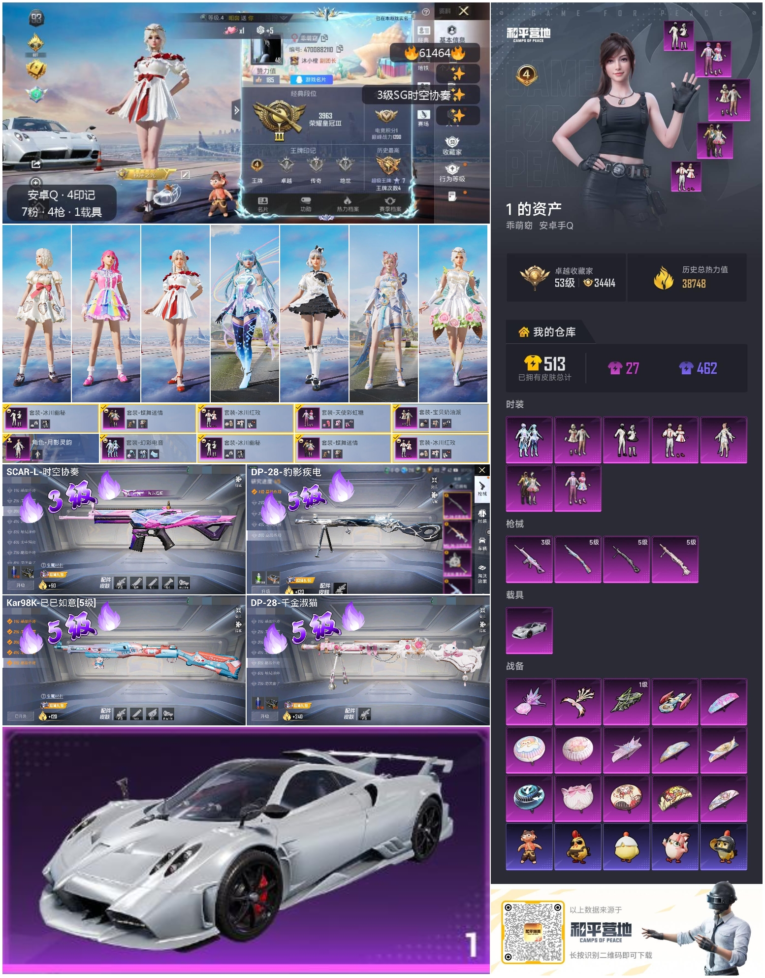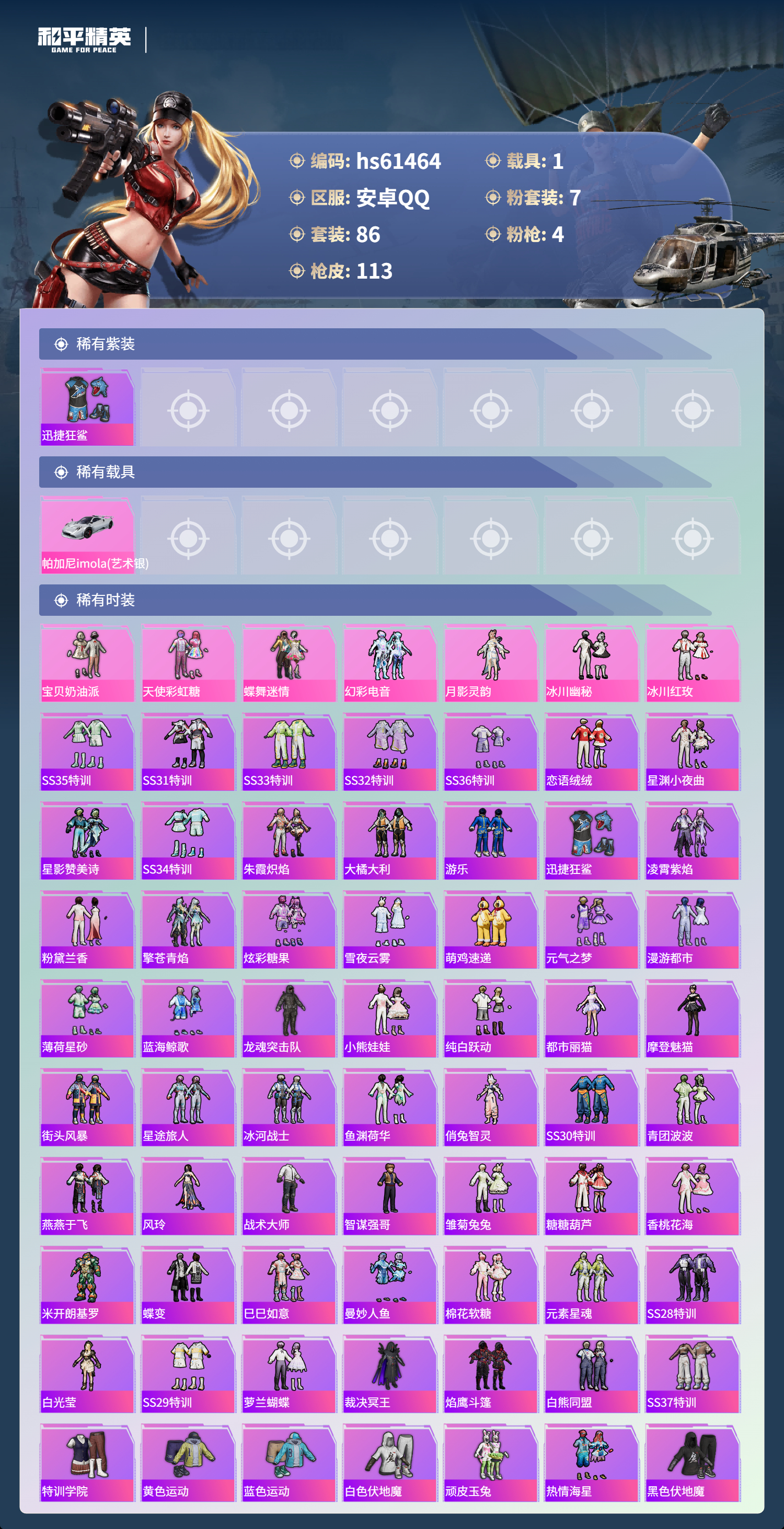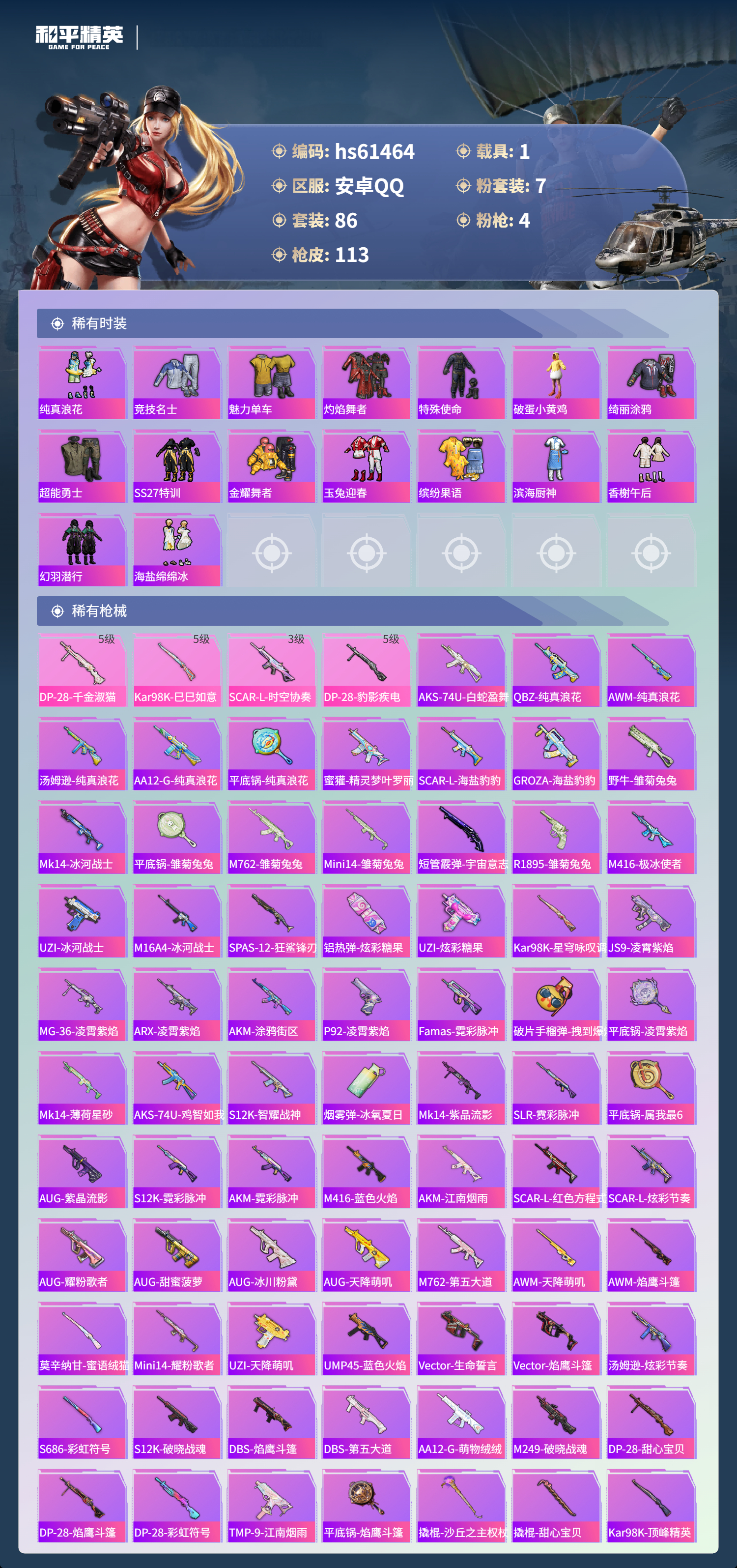 hs61464 安卓手Q-4王牌印记-7粉装-4特效枪-1载具-38748热力值-86套装-113枪皮