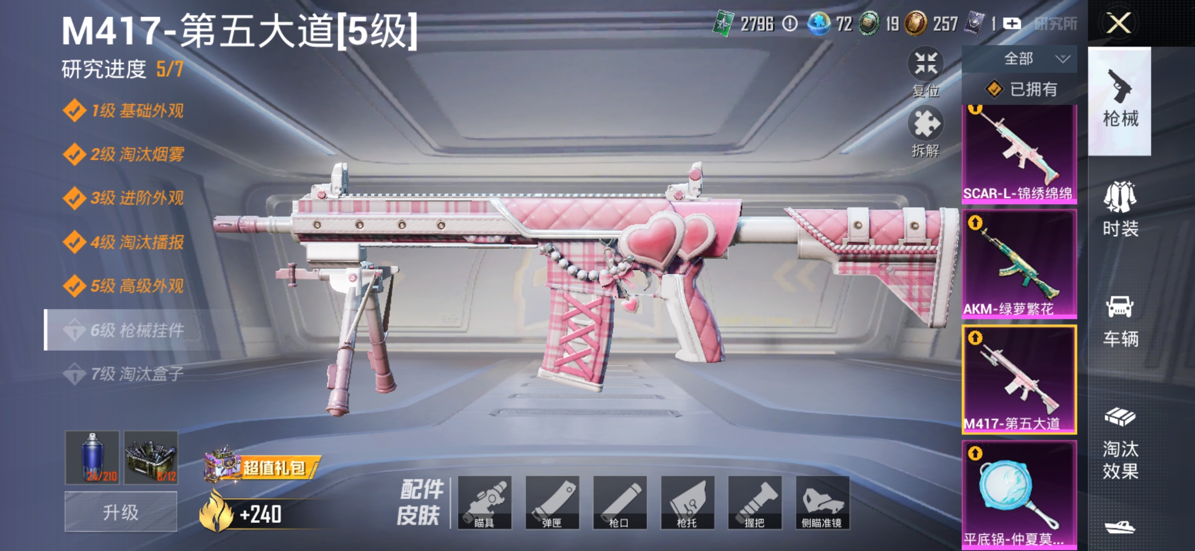 【7特效枪】 SCAR-L-锦绣绵绵 (5级) M416-电玩时刻 (5级) AKM-绿萝繁花 (5级) M762-青锋波束 (5级) UMP45-量子极限 (5级) M417-第五大道 (5级) 平底锅-仲夏莫吉托 (2级)