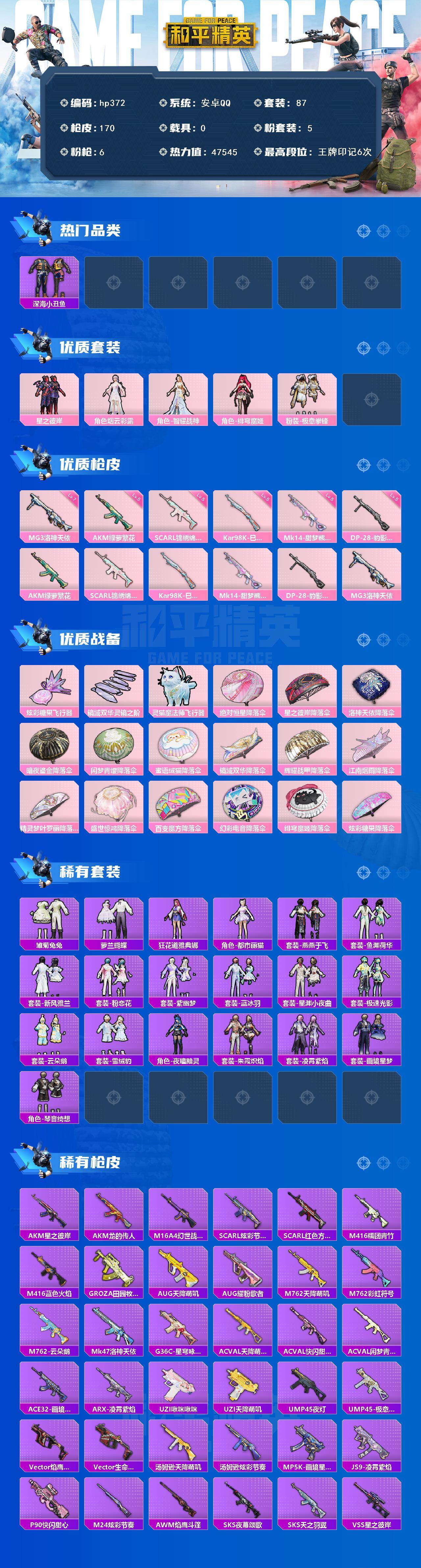 安卓 手Q-5粉装-6特效枪-0载具-3粉色飞行器-47545热力值-6王牌印记-87套装-170枪皮