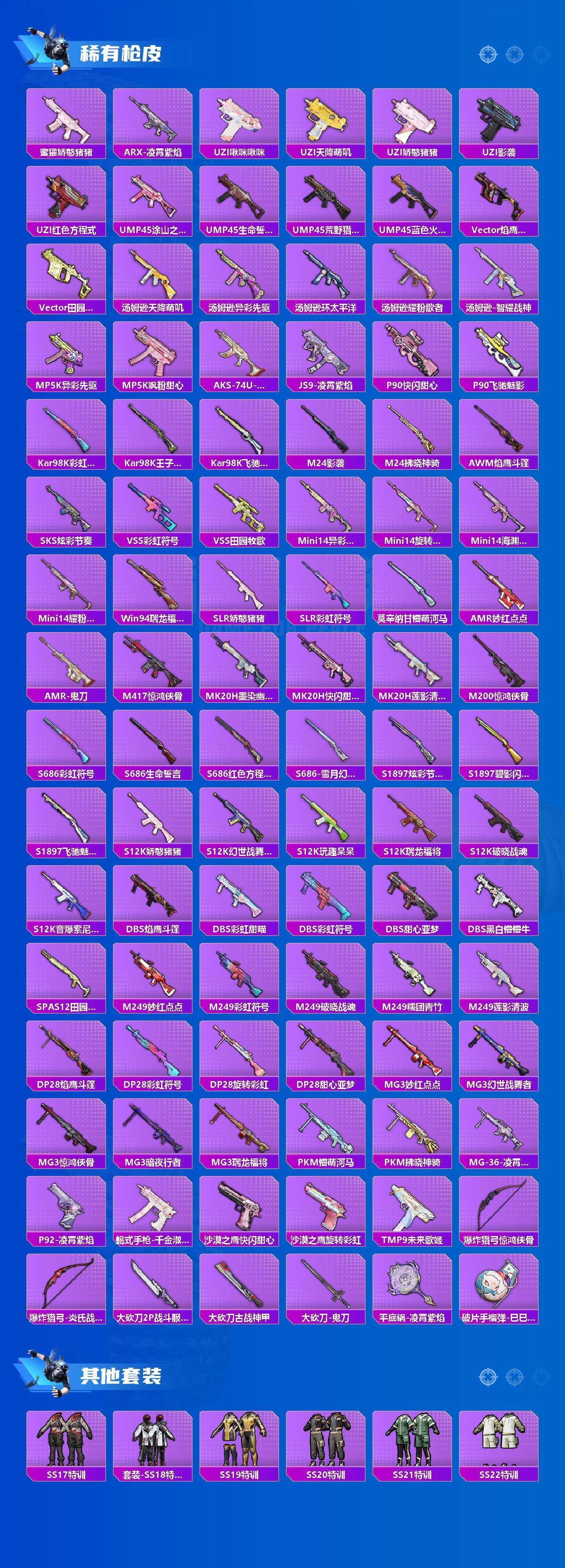 【粉色枪皮等级】:AKM-炫紫旋律(六级),M416-五爪金龙(七级),Kar98K-巳巳如意(五级),DP-28-千金淑猫(三级),DP-28-豹影疾电(五级)