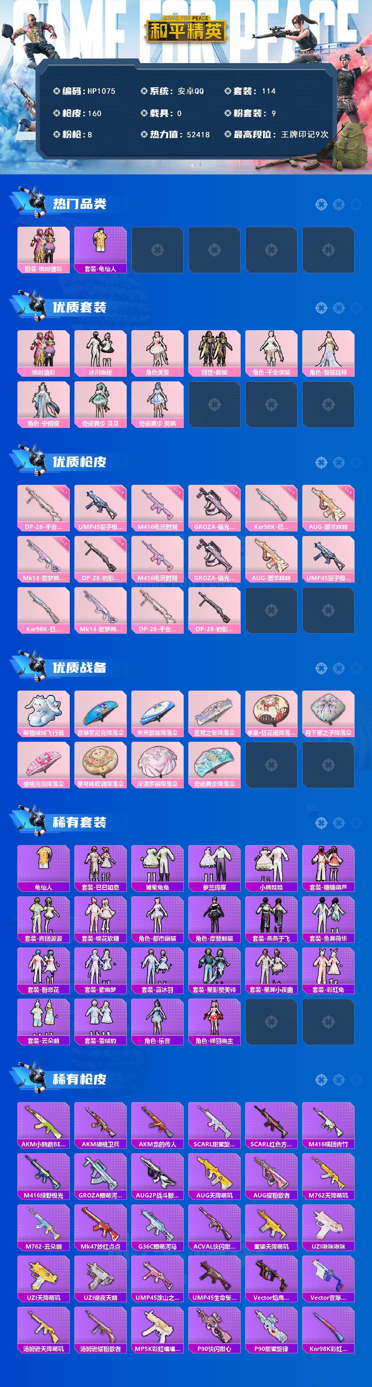 【HP1075】114套装/枪械8/装备232/战备128/王牌印记9/热力值52418/五级M416-电玩时刻/五级GROZA-镜光银凌/五级AUG-暖羊咩咩/五级UMP45-量子极限/五级Kar98K-巳巳如意/五级Mk14-甜梦熊击/七级DP-28-千金淑猫/四级DP-28-豹影疾电/粉装-缤纷油彩/套装-龟仙人/粉装-冰川幽秘/角色-美雪/套装-创世·救赎/角色-千金淑猫/角色-智耀战神/角色-宁雨蝶/角色-奇迹舞步 贝贝/角色-奇迹舞步 美琪/M416-电玩时刻/GROZA-镜光银凌/