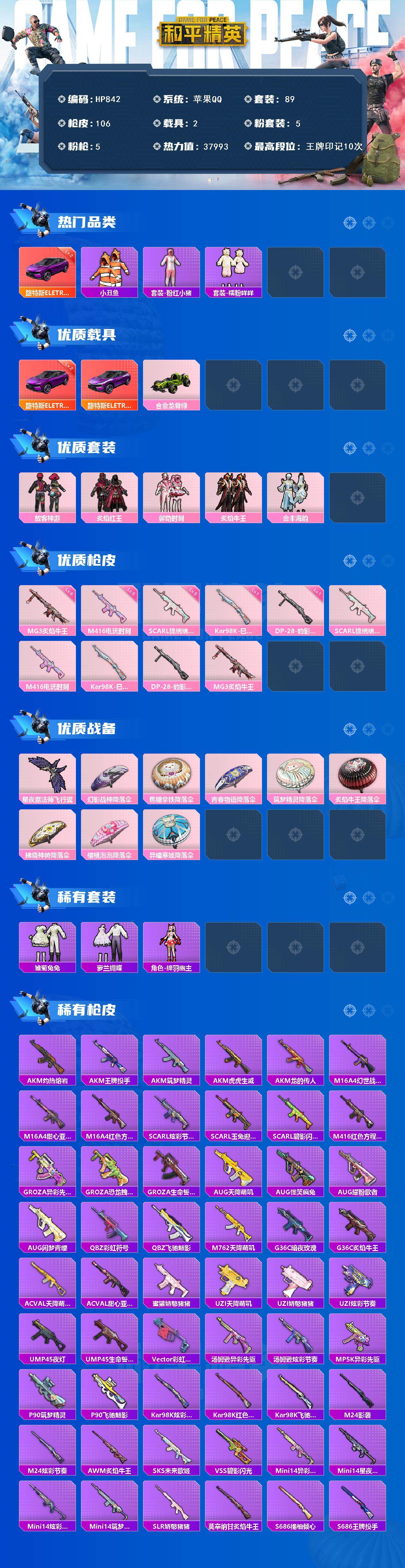 【HP842】89套装/枪械5/装备125/载具2/战备82/王牌印记10/热力值37993/五级SCAR-L-锦绣绵绵/五级M416-电玩时刻/一级Kar98K-巳巳如意/一级DP-28-豹影疾电/六级MG3-炙焰牛王/二级路特斯ELETRE(电光紫)/套装-小丑鱼/套装-粉红小猪/套装-糯粉咩咩/粉装-放客神游/粉装-炙焰红王/粉装-馨动时刻/粉装-炙焰牛王/粉装-金丰海韵/路特斯ELETRE(电光紫)/合金龙骨(绿)/SCAR-L-锦绣绵绵/M416-电玩时刻/Kar98K-巳巳如意/DP