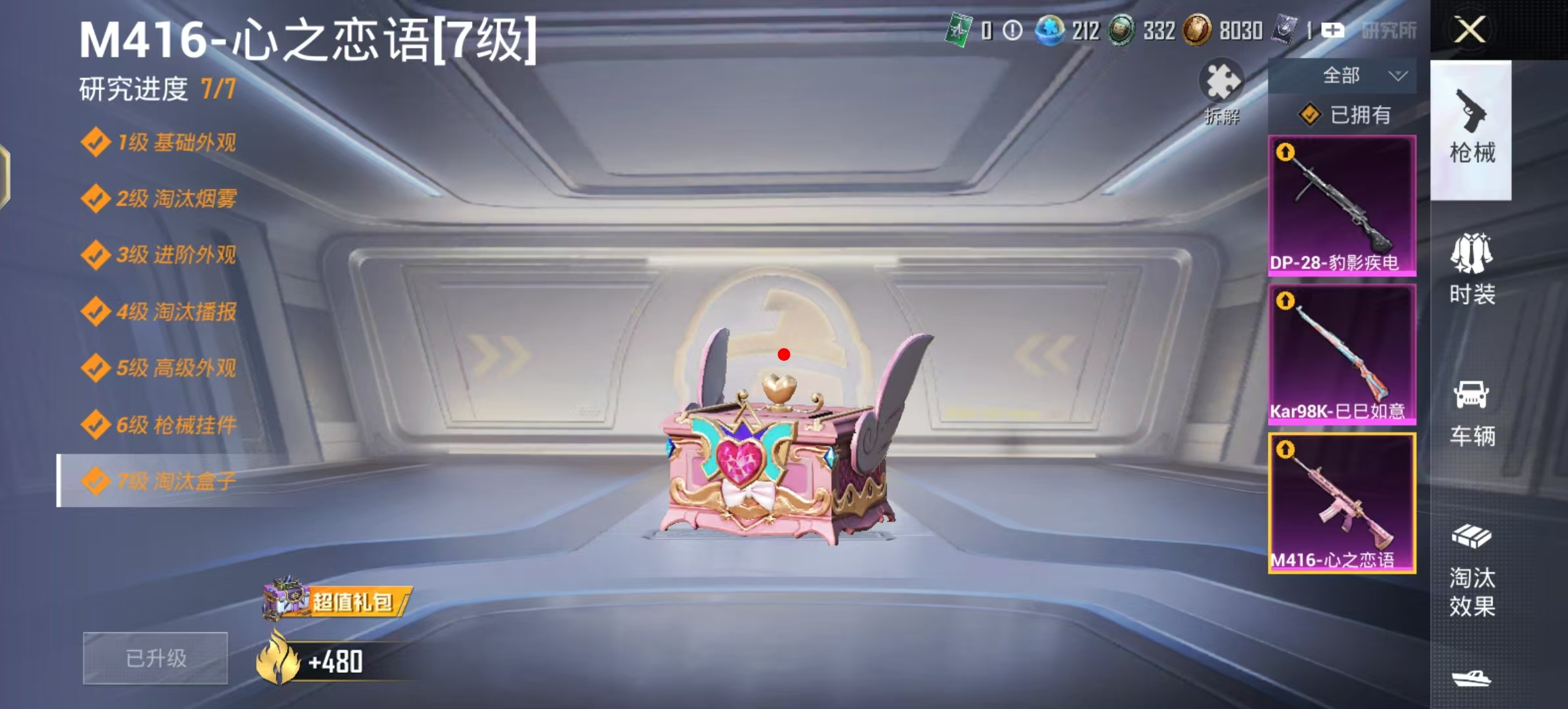 【3特效枪】 M416-心之恋语 (7级) Kar98K-巳巳如意 (4级) DP-28-豹影疾电 (2级)