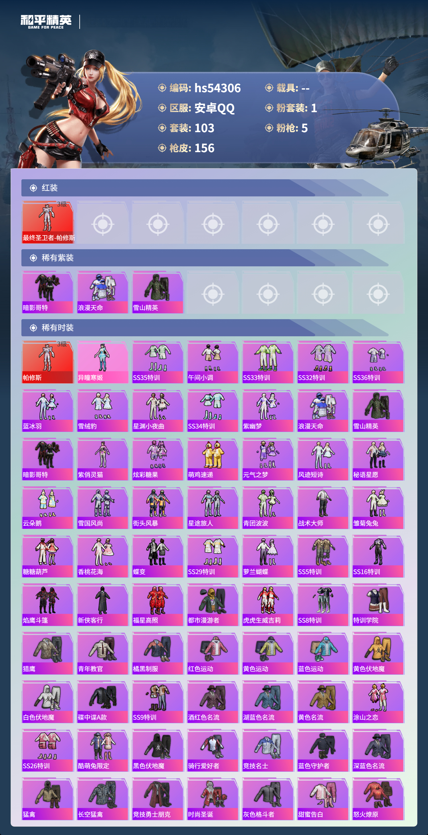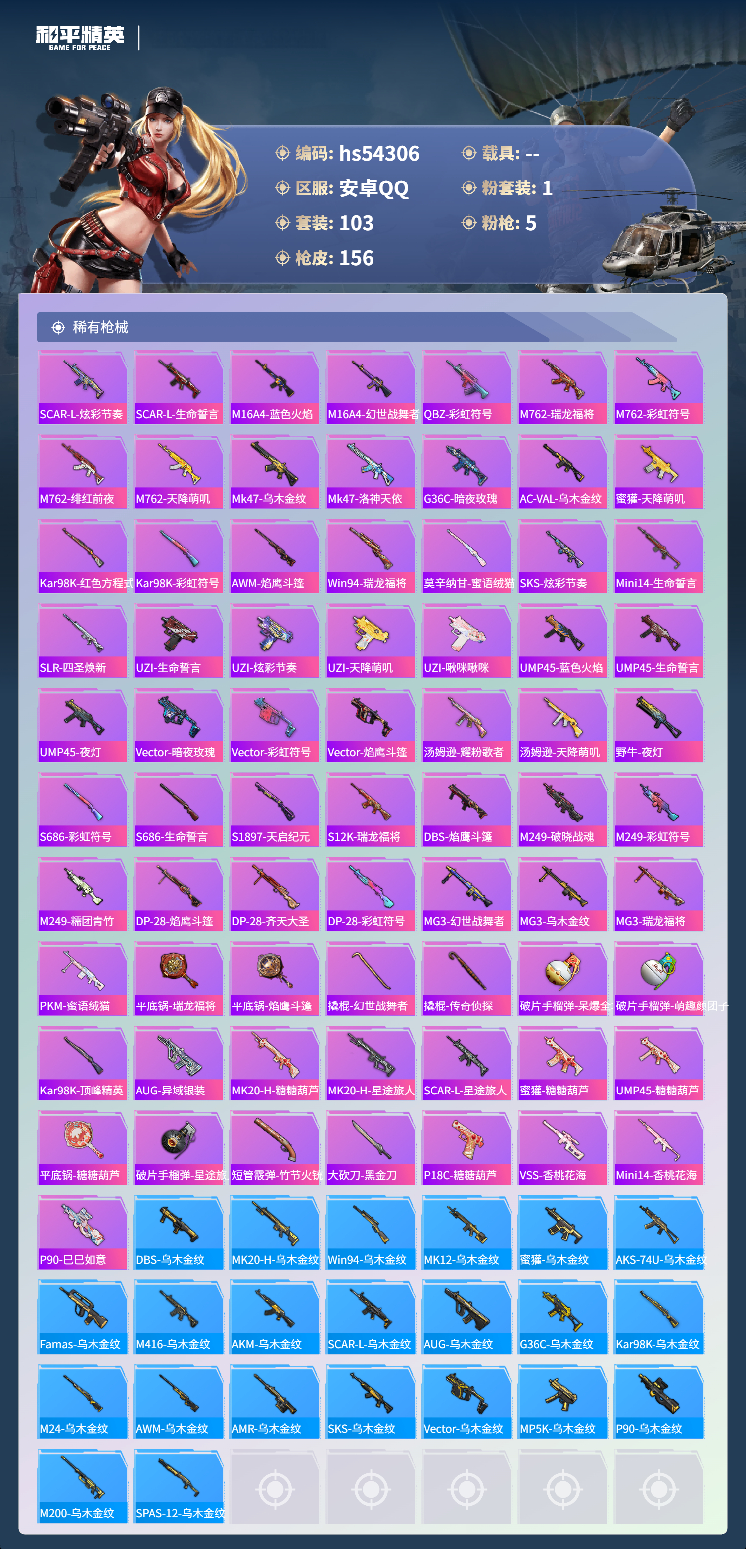 hs54306 安卓手Q-5王牌印记-1红装-1粉装-5特效枪-45669热力值-103套装-156枪皮