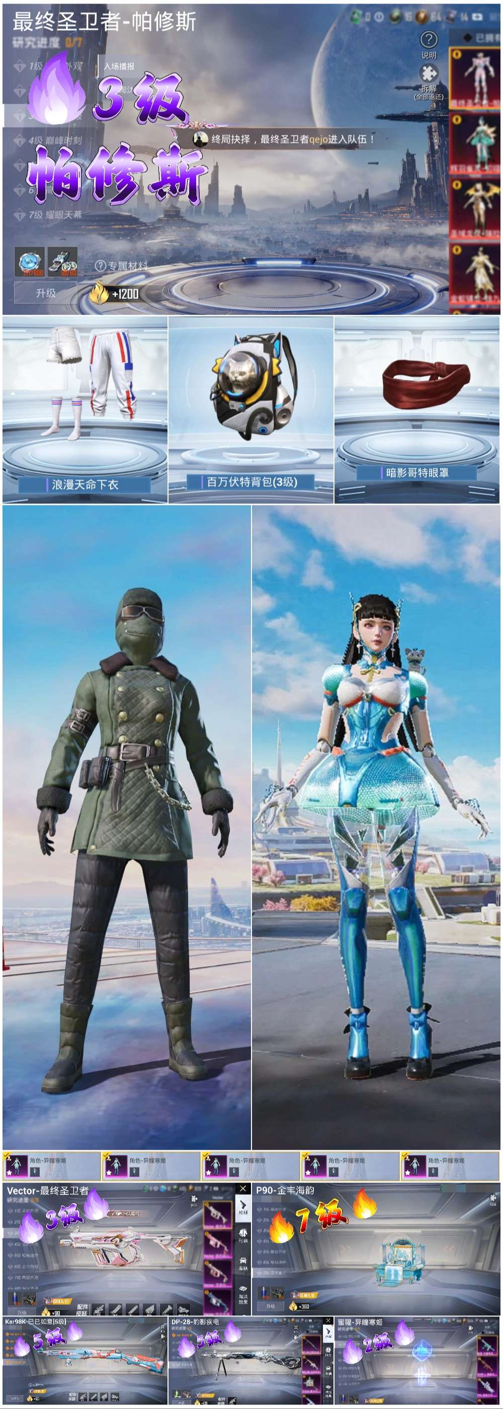 【5特效枪】Kar98K-巳巳如意/5级,DP-28-豹影疾电/5级,蜜獾-异瞳寒姬/2级,Vector-最终圣卫者/3级,P90-金丰海韵/7级