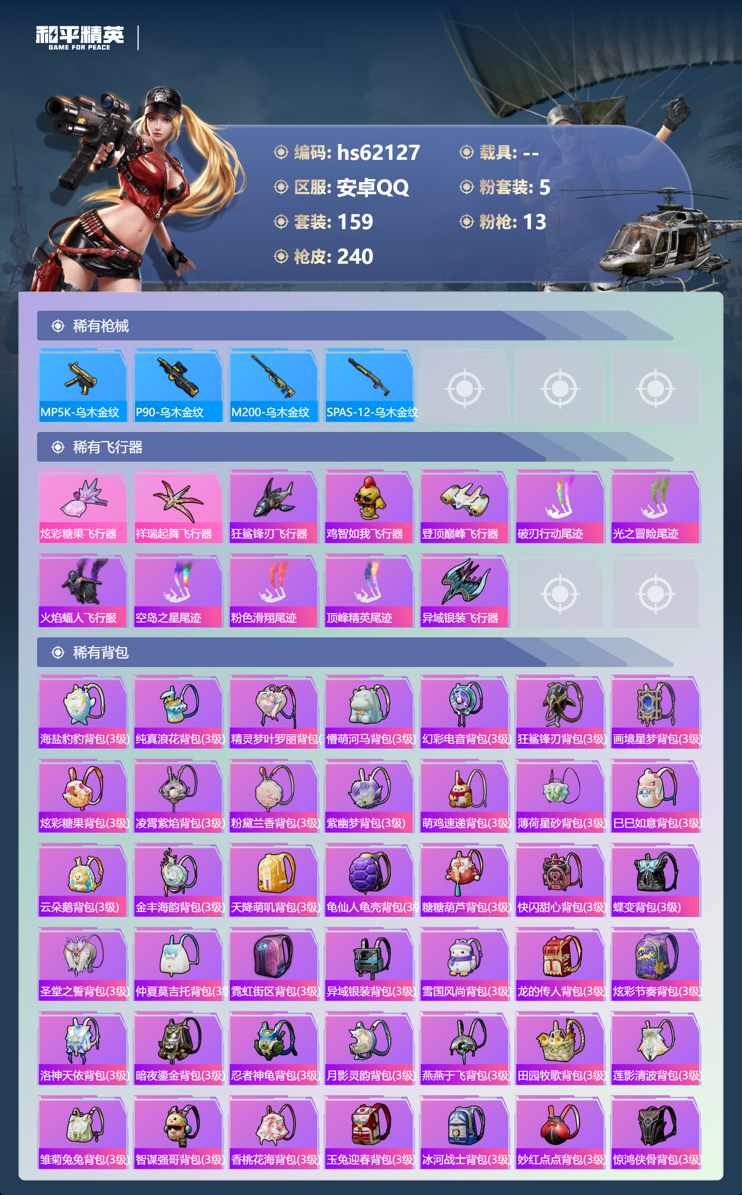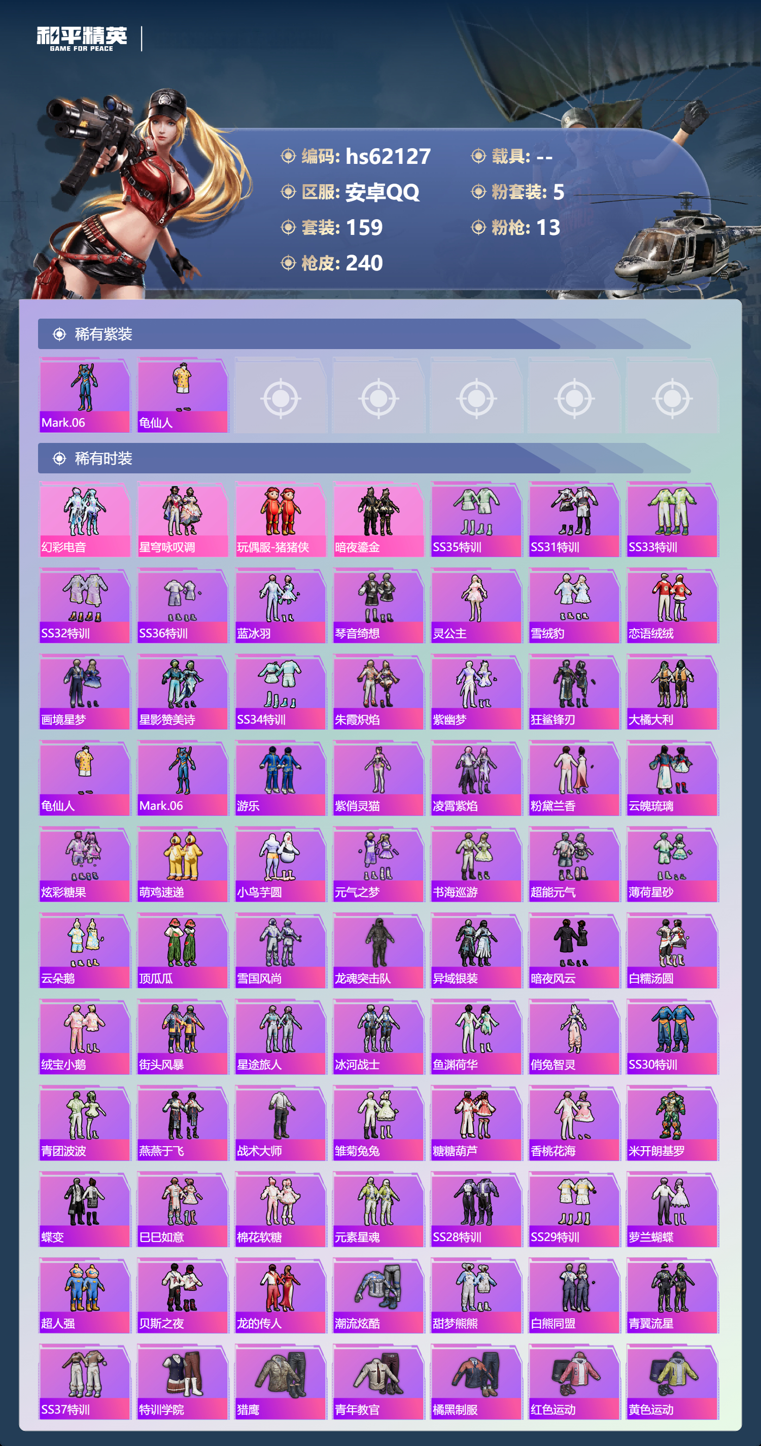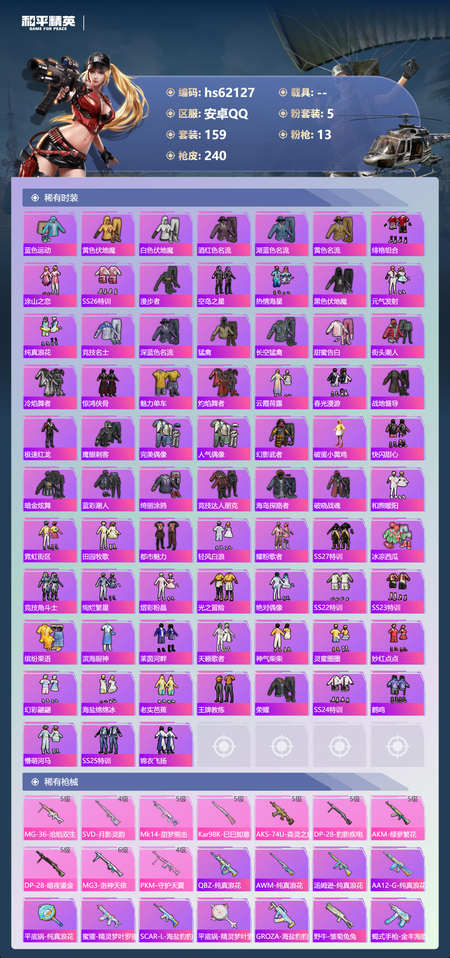 hs62127 安卓手Q-15王牌印记-5粉装-13特效枪-73312热力值-159套装-240枪皮-2卓越印记