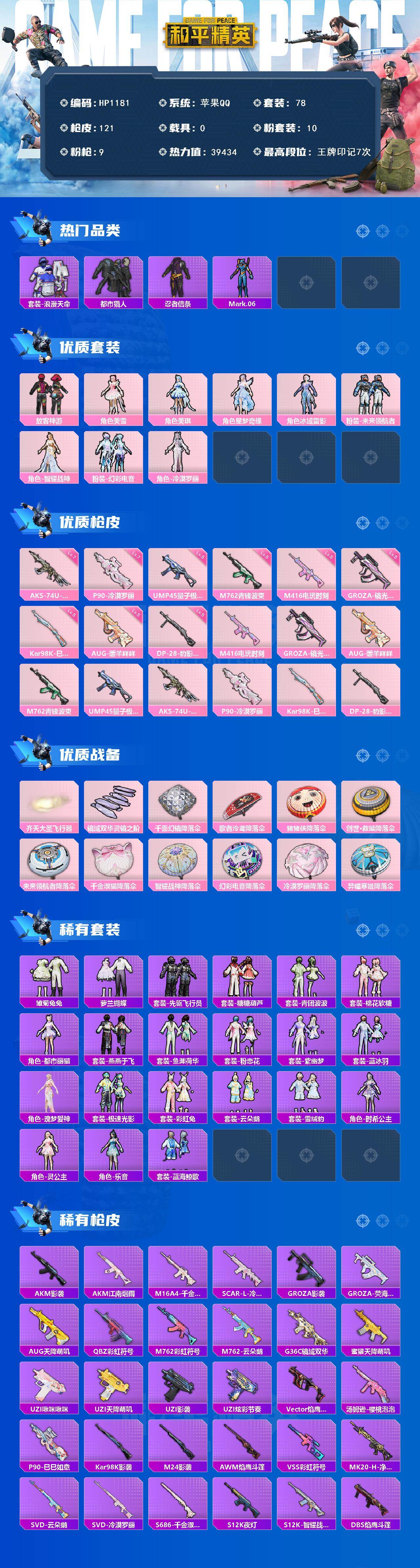 【HP1181】78套装/枪械9/装备164/战备93/王牌印记7/热力值39434/五级M416-电玩时刻/五级GROZA-镜光银凌/五级AUG-暖羊咩咩/五级M762-青锋波束/五级UMP45-量子极限/七级AKS-74U-信仰神谕/七级P90-冷漠罗丽/五级Kar98K-巳巳如意/五级DP-28-豹影疾电/套装-浪漫天命/套装-都市猎人/套装-忍者信条/角色-Mark.06/粉装-放客神游/角色-美雪/角色-美琪/角色-星梦奇缘/角色-冰域雷影/粉装-未来领航者/角色-智耀战神/粉装-幻彩