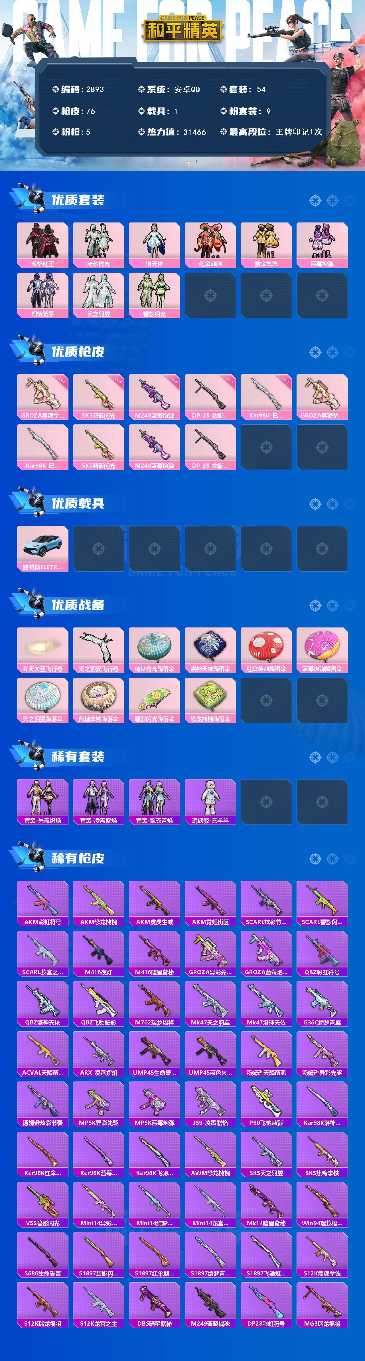 安卓 手Q-9粉装-5特效枪-1载具-2粉色飞行器-31466热力值-1王牌印记-54套装-76枪皮
