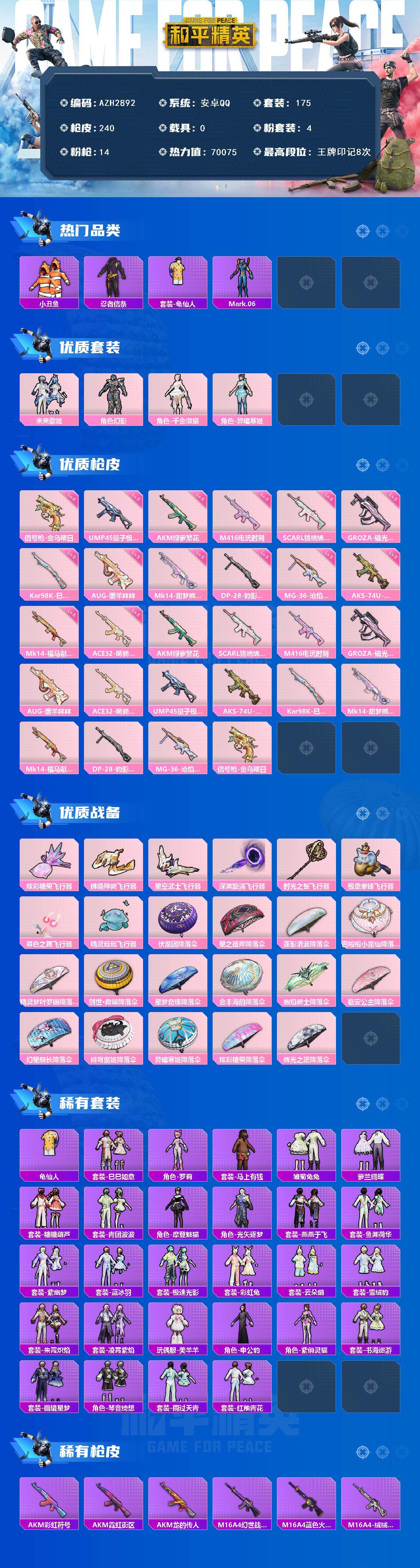 【AZH2892】安卓 手Q【千金淑猫 摩登魅猫 美羊羊小丑鱼】4粉装-14特效枪-0载具-8粉色飞行器-70075热力值-8王牌印记-175套装-240枪皮