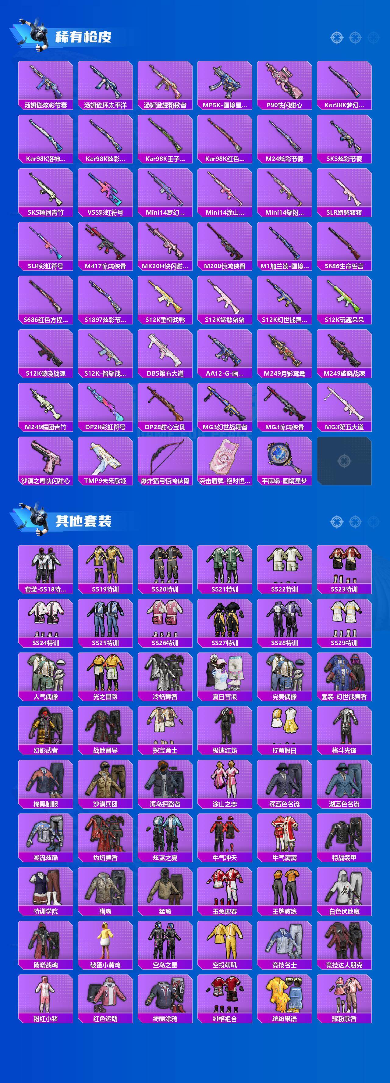 【粉色枪皮等级】:SCAR-L-锦绣绵绵(五级),M416-电玩时刻(五级),GROZA-旋转彩虹(四级),AKS-74U-森灵之息(四级),Kar98K-未来歌姬(一级),Kar98K-