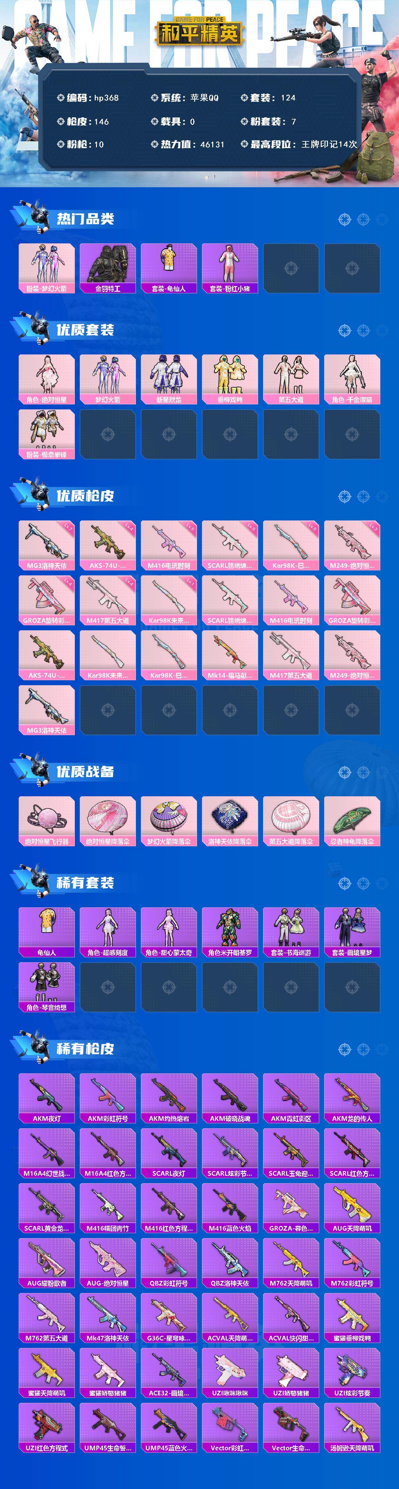 苹果 手Q-7粉装-10特效枪-0载具-1粉色飞行器-46131热力值-14王牌印记-124套装-146枪皮