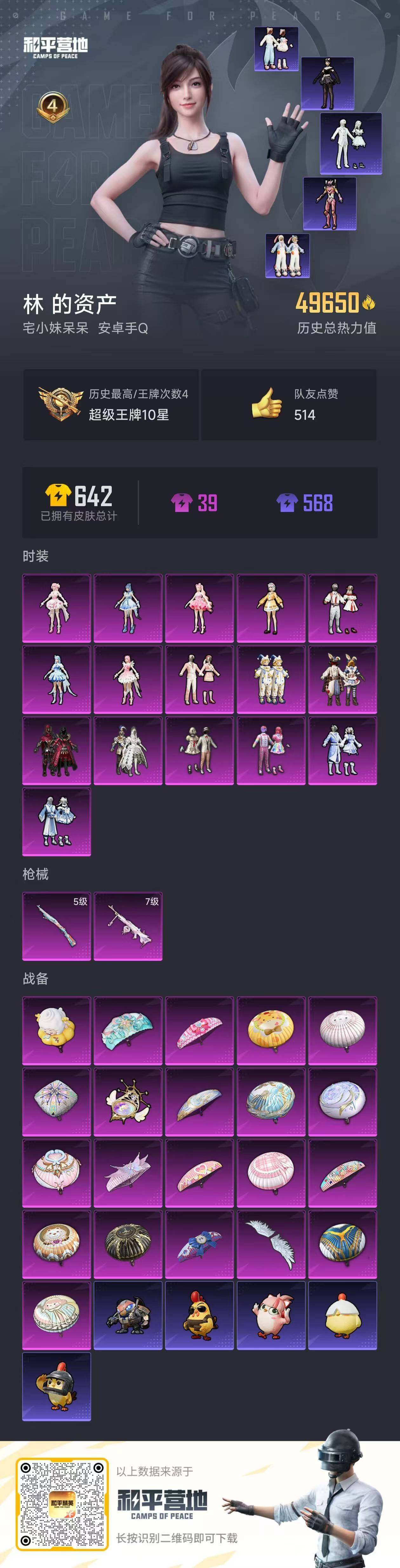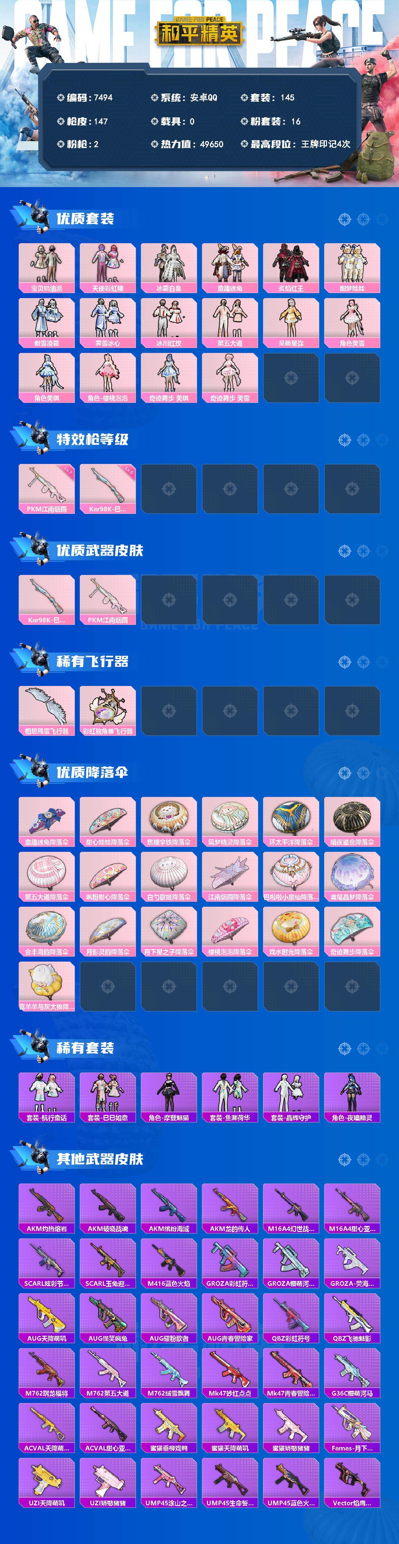 安卓 手Q-16粉装-2特效枪-0载具-2粉色飞行器-49650热力值-4王牌印记-145套装-147枪皮