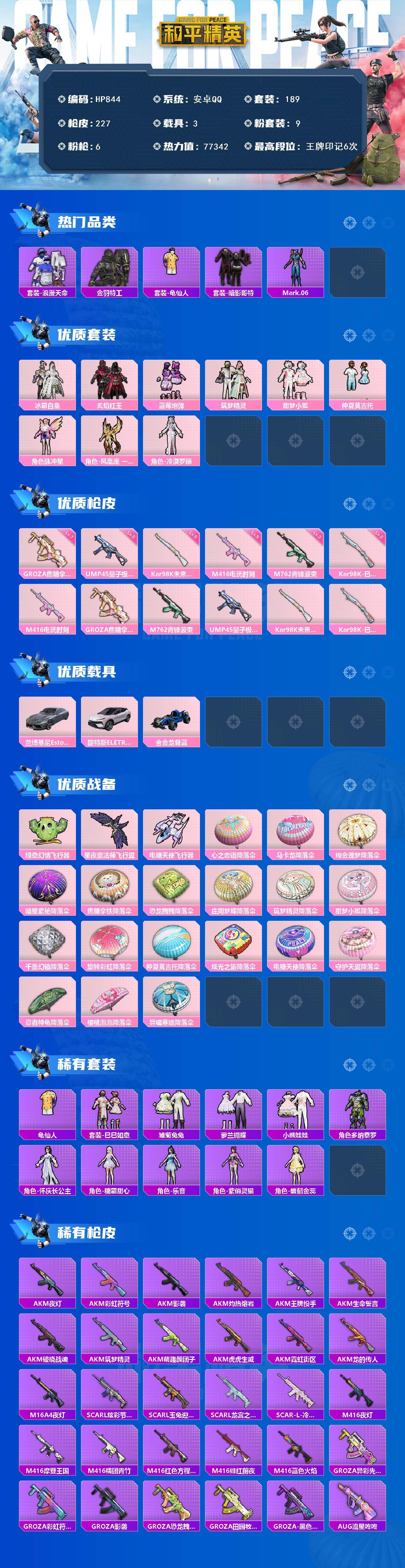 【HP844】189套装/枪械6/装备291/载具3/战备160/王牌印记6/热力值77342/五级M416-电玩时刻/七级GROZA-焦糖拿铁/三级M762-青锋波束/五级UMP45-量子极限/五级Kar98K-未来歌姬/二级Kar98K-巳巳如意/套装-浪漫天命/套装-金羽特工/套装-龟仙人/套装-暗影哥特/角色-Mark.06/粉装-冰霜白皇/粉装-炙焰红王/粉装-蓝莓炮弹/粉装-筑梦精灵/粉装-甜梦小狐/粉装-仲夏莫吉托/角色-脉冲星/角色-凤凰座 一辉/角色-冷漠罗丽/兰博基尼Esto