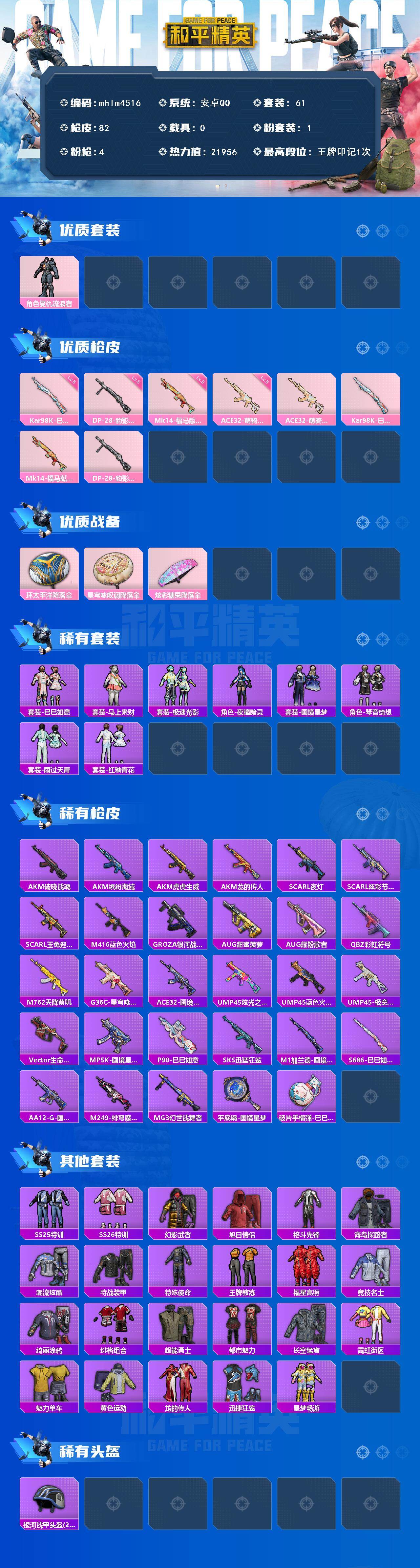【mhlm4516】安卓 手Q-1粉装-4特效枪-0载具-0粉色飞行器-21956热力值-1王牌印记-61套装-82枪皮