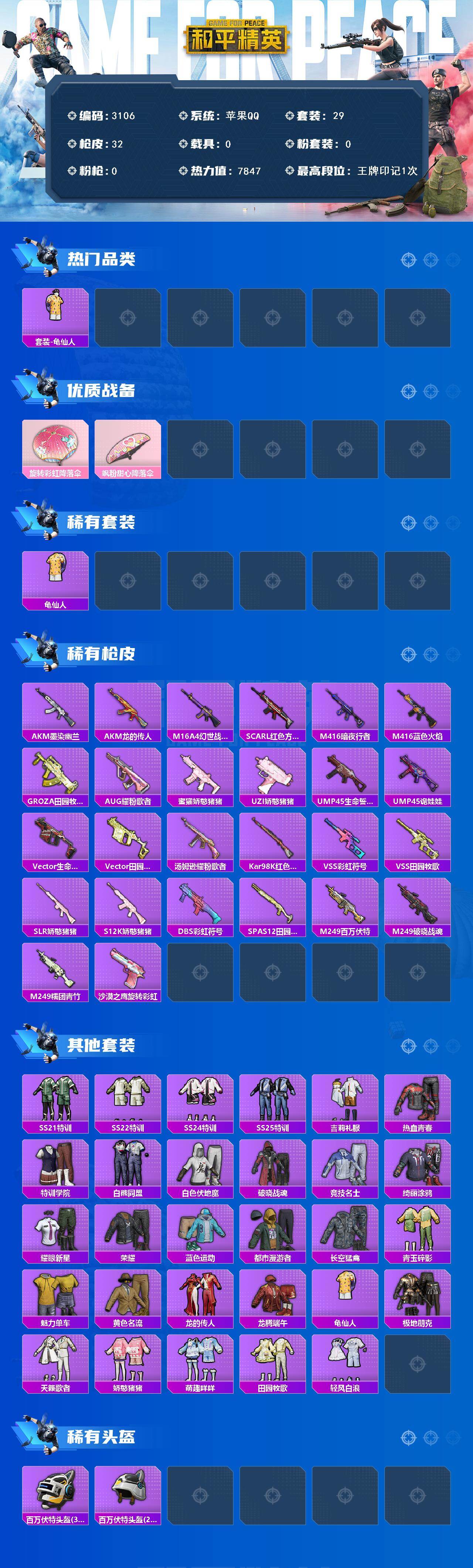 苹果 手Q-0粉装-0特效枪-0载具-0粉色飞行器-7847热力值-1王牌印记-29套装-32枪皮