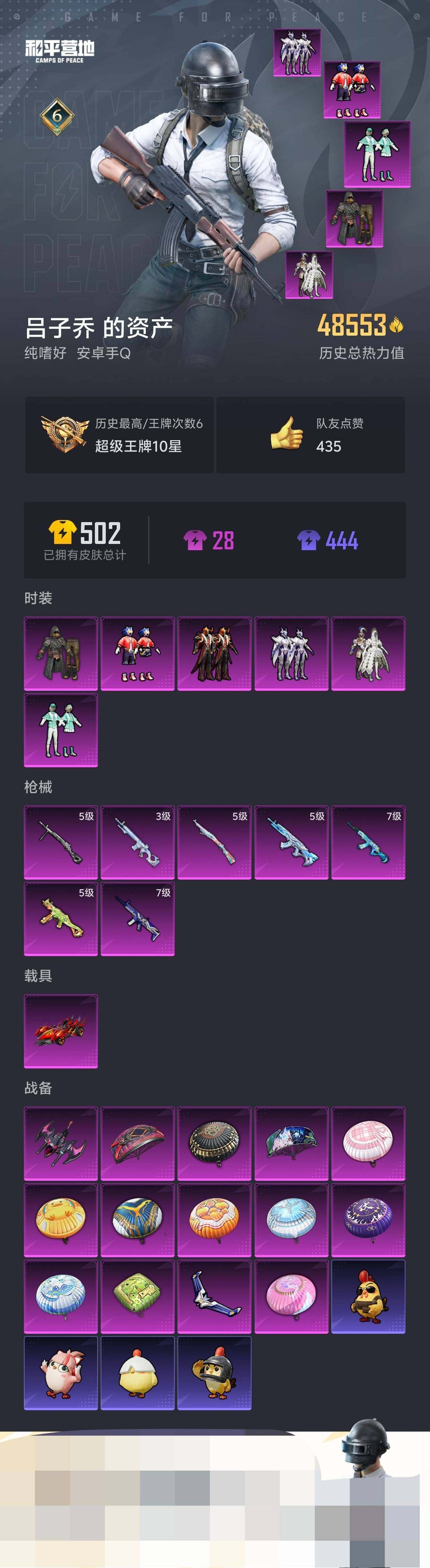安卓 手Q-6粉装-7特效枪-1载具-2粉色飞行器-48553热力值-6王牌印记,地铁满天赋,物资多【热门品类】:粉装-音爆索尼克,套装-粉红小猪【粉色套装】:粉装-极限特训,粉装-冰霜白皇,粉装-薄荷物语,粉装-紫电风暴,粉装-炙焰牛王,粉装-音爆索尼克【粉色枪皮等级】:AKM-百合蜜语(七级),SCAR-L-青春物语(七级),M762-冷魅冰骑(五级),UMP45-恐龙拽拽(五级),Kar98K-巳巳如意(五级),MK12-雪月幻音(三级),DP-28-豹影疾电(五级)【粉色载具】:焰龙咆哮