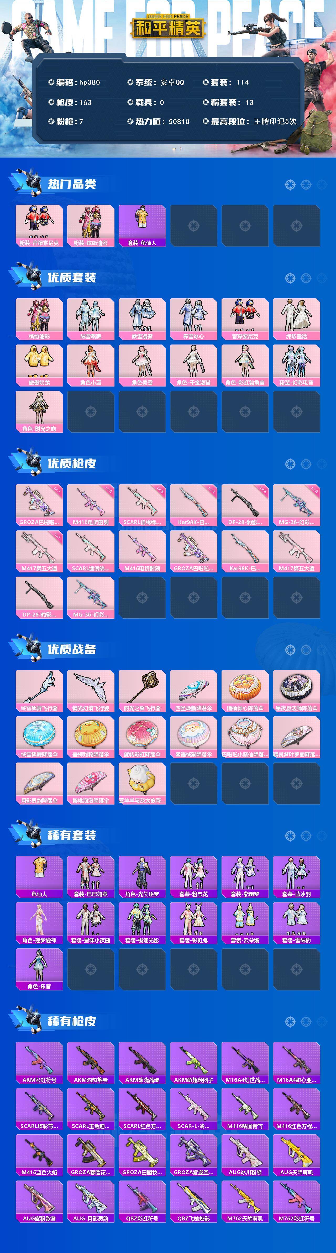 安卓 手Q-13粉装-7特效枪-0载具-3粉色飞行器-50810热力值-5王牌印记-114套装-163枪皮