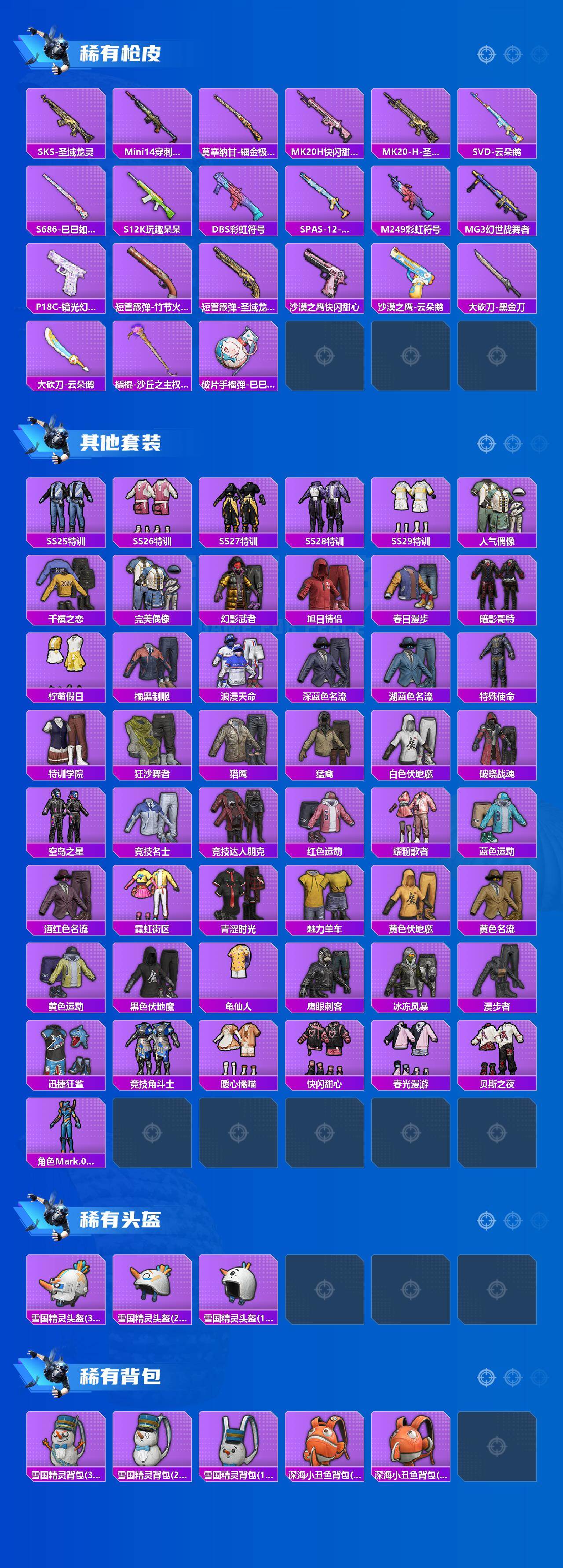 【热门品类】:粉装-雪国幻梦,套装-浪漫天命,套装-小丑鱼,套装-龟仙人,套装-暗影哥特,角色-Mark.06