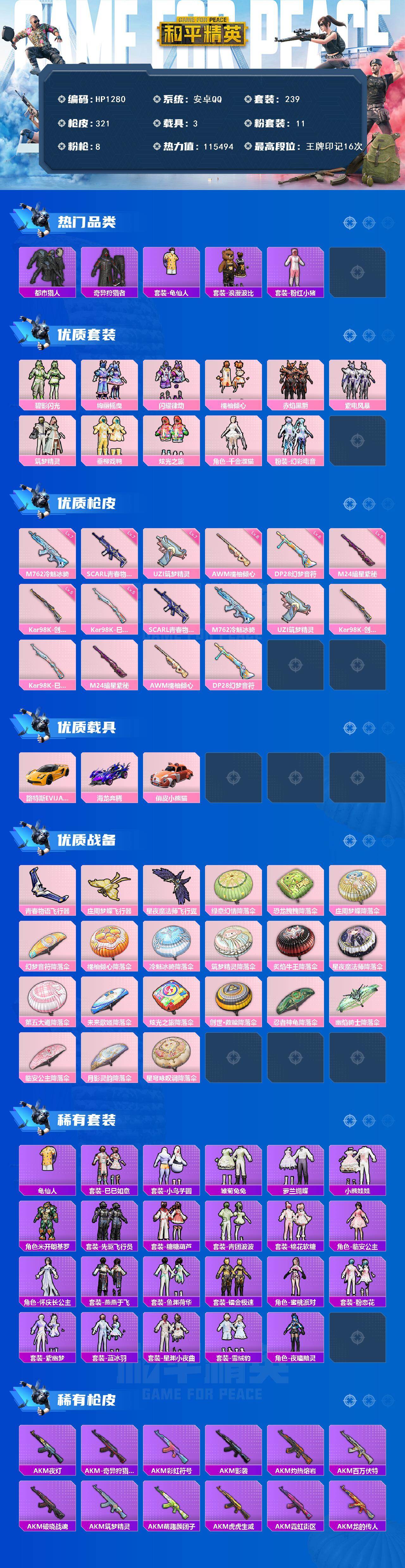 【HP1280】239套装/枪械8/装备446/载具3/战备239/王牌印记16/热力值115494/七级SCAR-L-青春物语/七级M762-冷魅冰骑/七级UZI-筑梦精灵/五级Kar98K-创世·救赎/五级Kar98K-巳巳如意/五级M24-暗星紫秘/六级AWM-橘柚倾心/六级DP-28-幻梦音符/套装-都市猎人/套装-奇异狩猎者/套装-龟仙人/套装-浪漫波比/套装-粉红小猪/粉装-碧影闪光/粉装-绚丽摇曳/粉装-闪耀律动/粉装-橘柚倾心/粉装-赤焰黑爵/粉装-紫电风暴/粉装-筑梦精灵/粉装