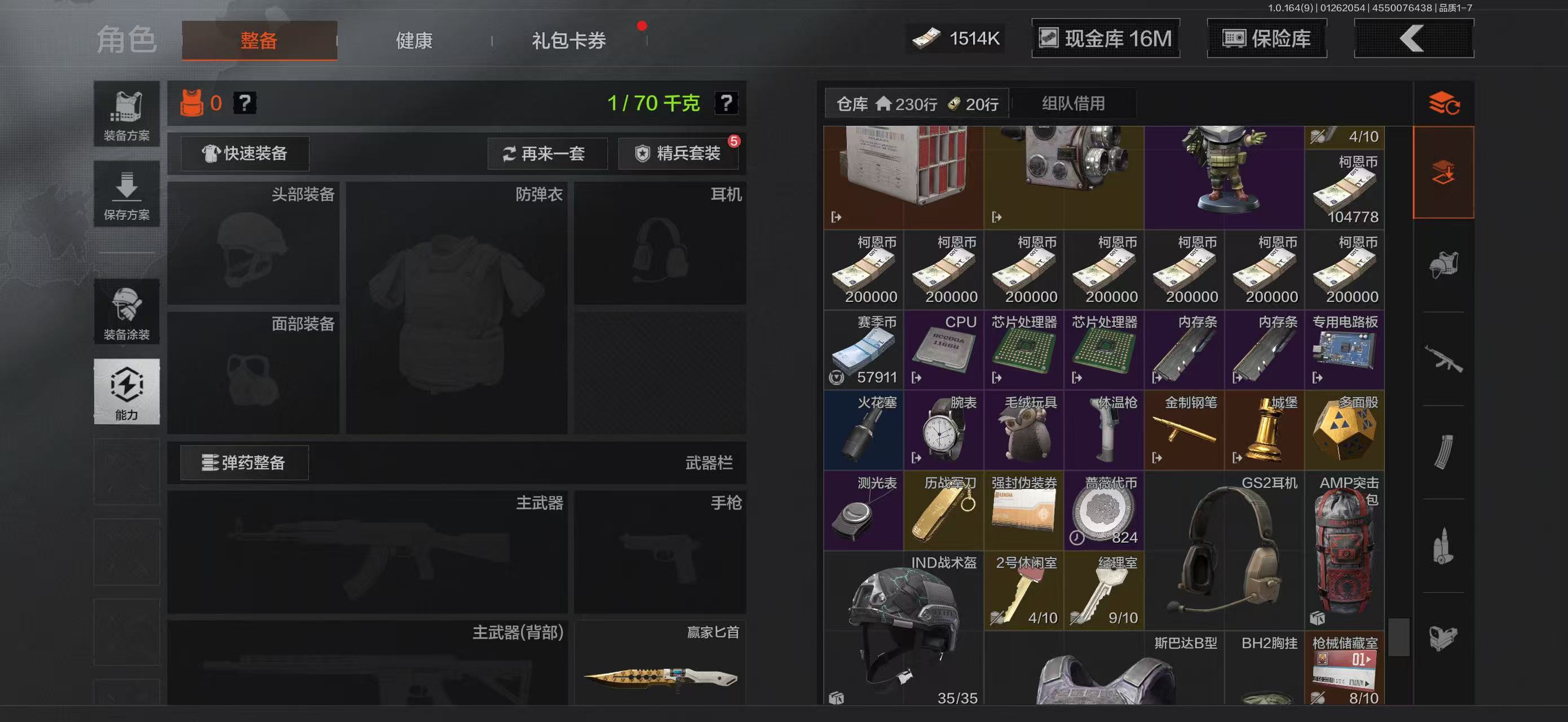 【包人脸】65M1514K科恩币【近战武器】工兵铲急袭弯刀开山刀赢家匕首【手套】苍白之触手套【金色枪皮】冲刺极限·QBZ192骑士之剑AX50包络战术AKM近卫荣