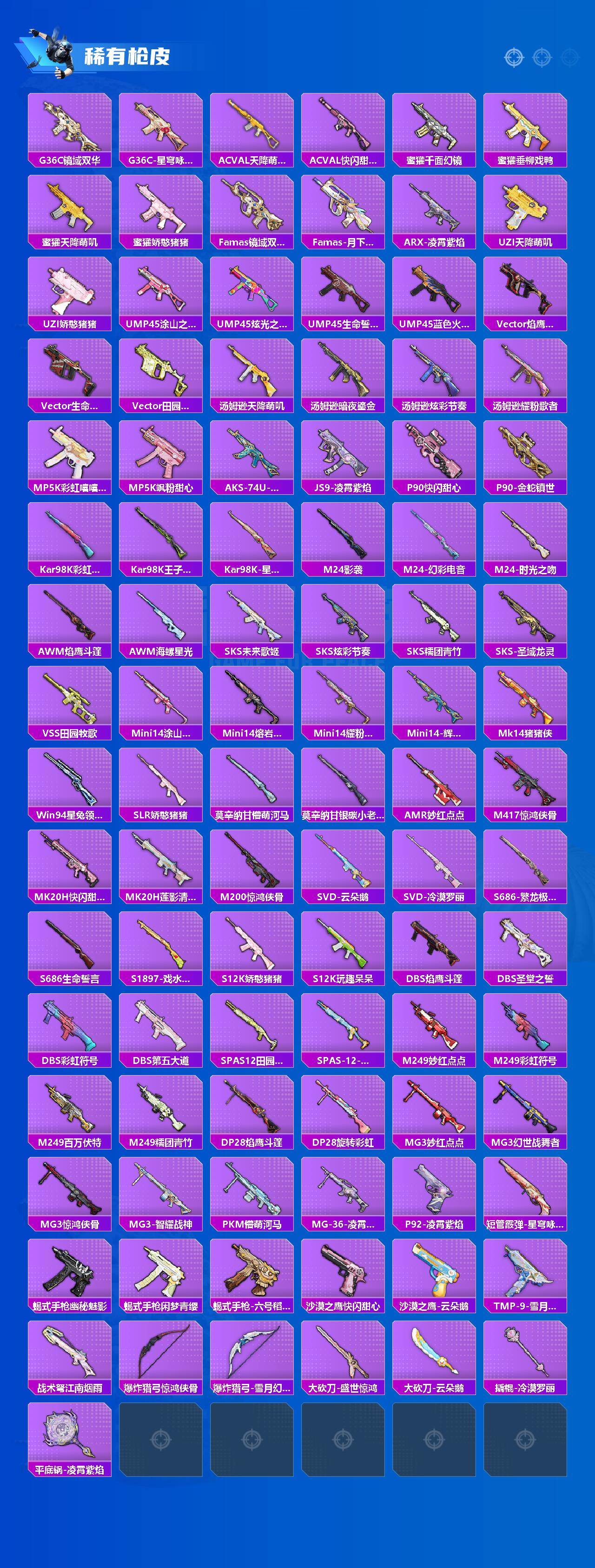【粉色枪皮等级】:M416-风花雪月(五级),AKS-74U-星穹咏叹调(五级),P90-冷漠罗丽(三级),P90-魔童闹海 敖丙(三级),Kar98K-巳巳如意(五级),Kar98K-圣
