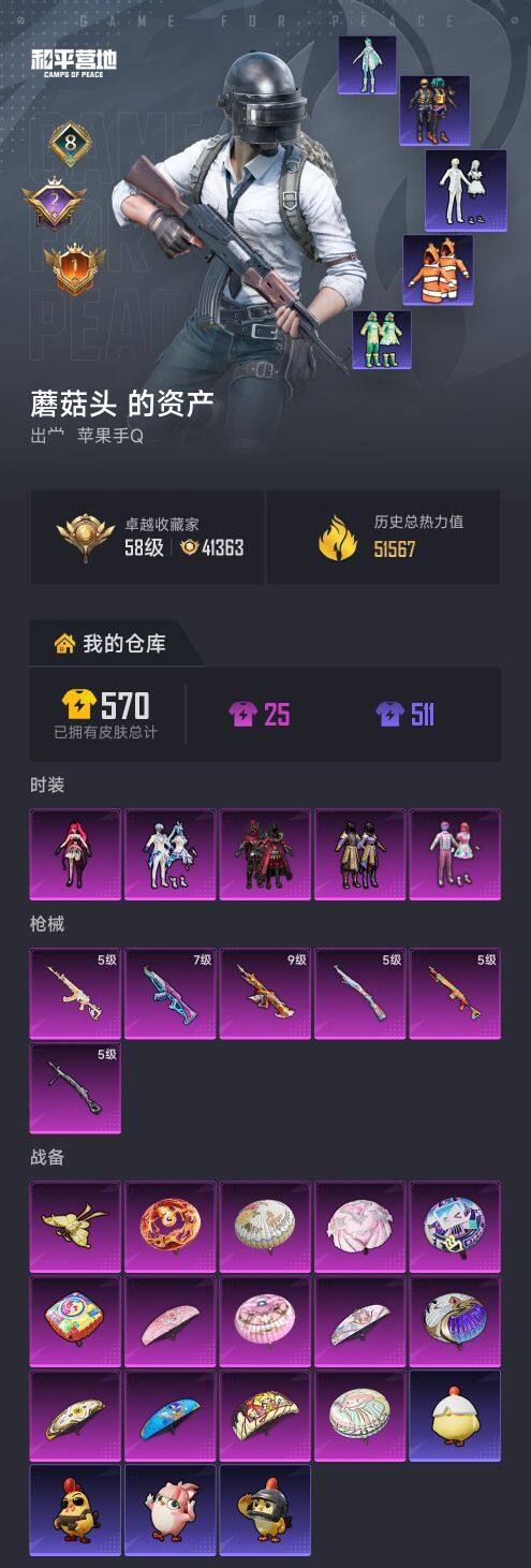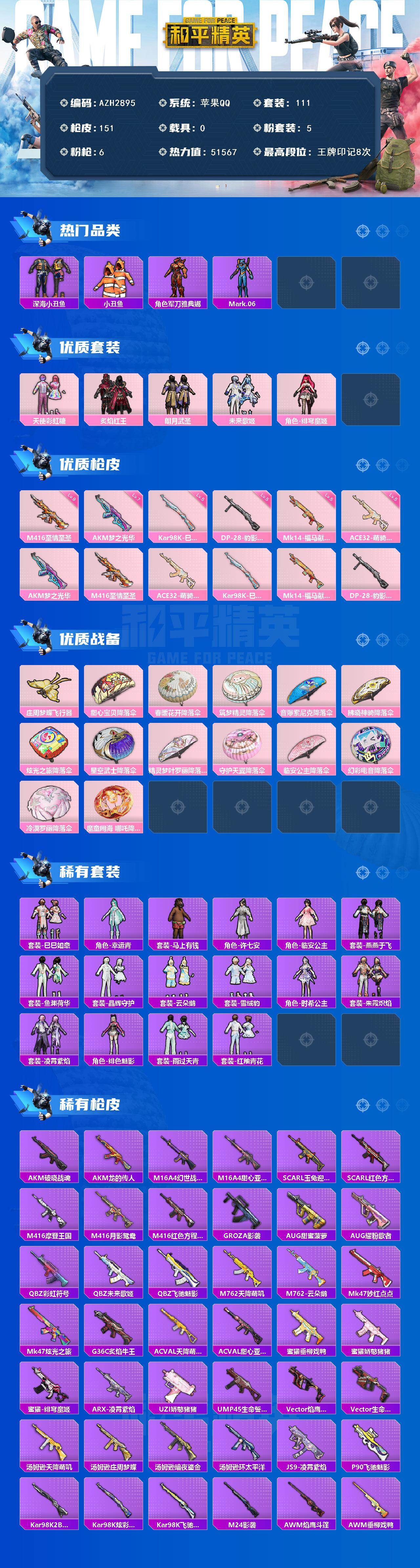 【AZH2895】苹果 手Q【天使彩虹糖 绯穹魔姬 深海小丑鱼 满级梦之光华AKM 满级至情至圣M416】5粉装-6特效枪-0载具-1粉色飞行器-51567热力值-8王牌印记-111套装-151枪皮