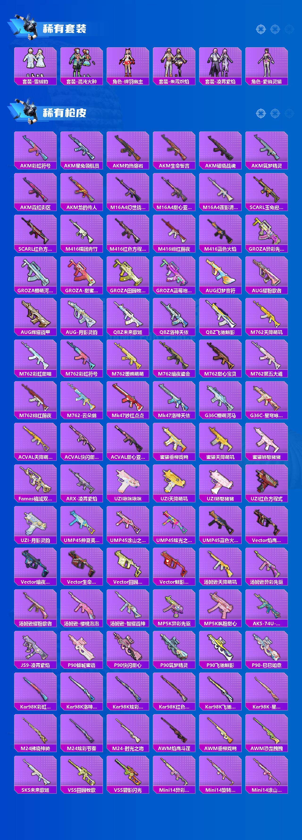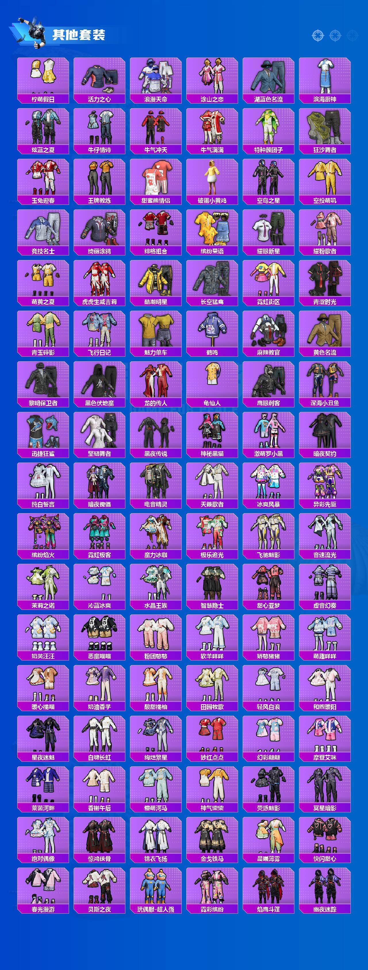 【粉色套装】:粉装-精灵娃娃,粉装-酣梦娃娃,粉装-恐龙拽拽,粉装-筑梦精灵,粉装-旋转彩虹,粉装-冰川幽秘,粉装-暗夜鎏金,角色-小可学妹,角色-茉莉星,角色-圣堂之誓,角色-烟云彩露,角色-小蓝,角色-美雪,角色-美琪,角色-千金淑猫,角色-女娲灵识,粉装-星穹咏叹调,角色-冷漠