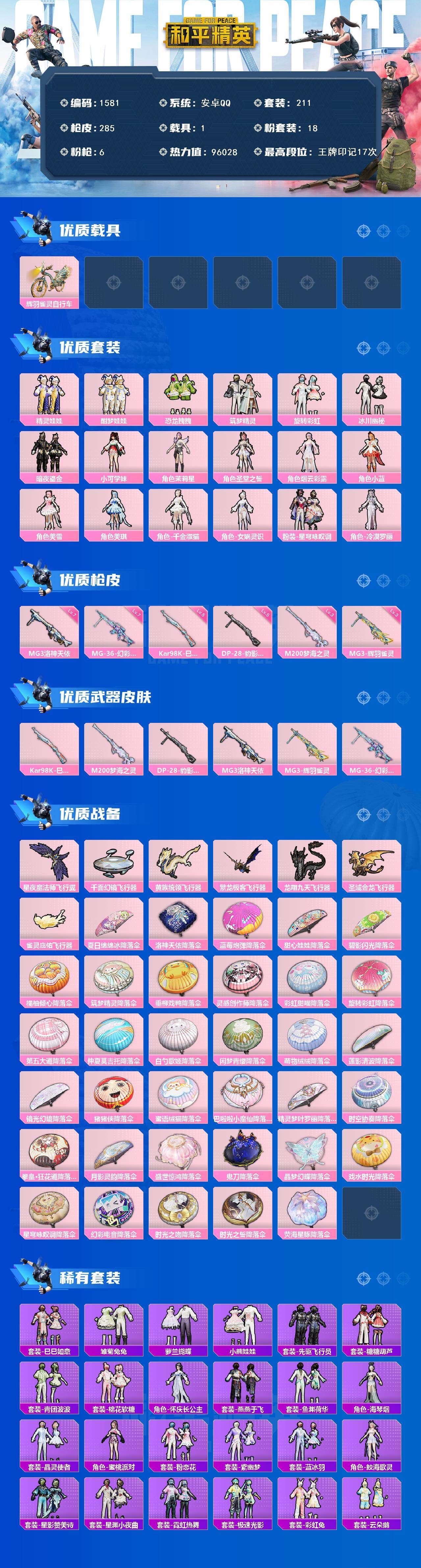 安卓 手Q-18粉装-6特效枪-1载具-7粉色飞行器-96028热力值-17王牌印记-211套装-285枪皮