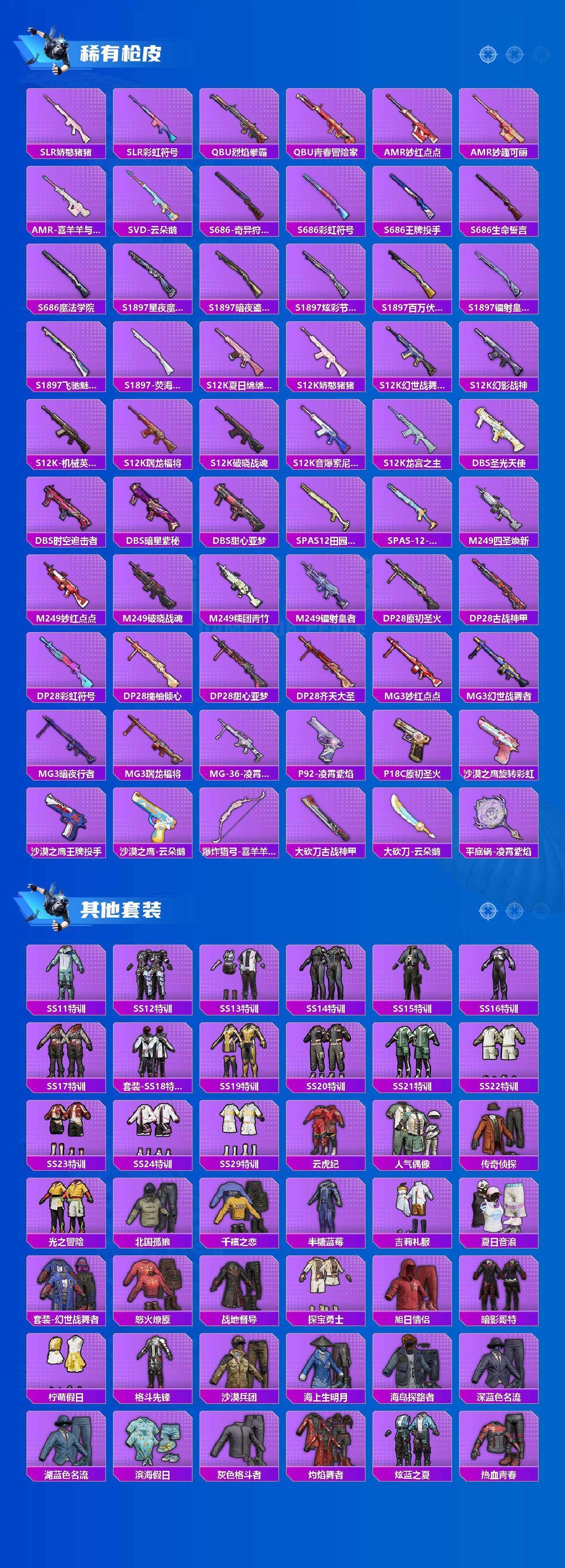 【粉色套装】:粉装-翡翠骑士,粉装-星之彼岸,粉装-炙焰赤龙,粉装-飓风飞鹰,粉装-骨龙祭渊,粉装-暗夜玫瑰,粉装-彩虹鹿灵,粉装-山涧鹿灵,粉装-吟月归客,粉装-海盐物语,粉装-紫电风暴,粉装-筑梦精灵,粉装-星夜魔法师,角色-罗征,角色-绯穹魔姬