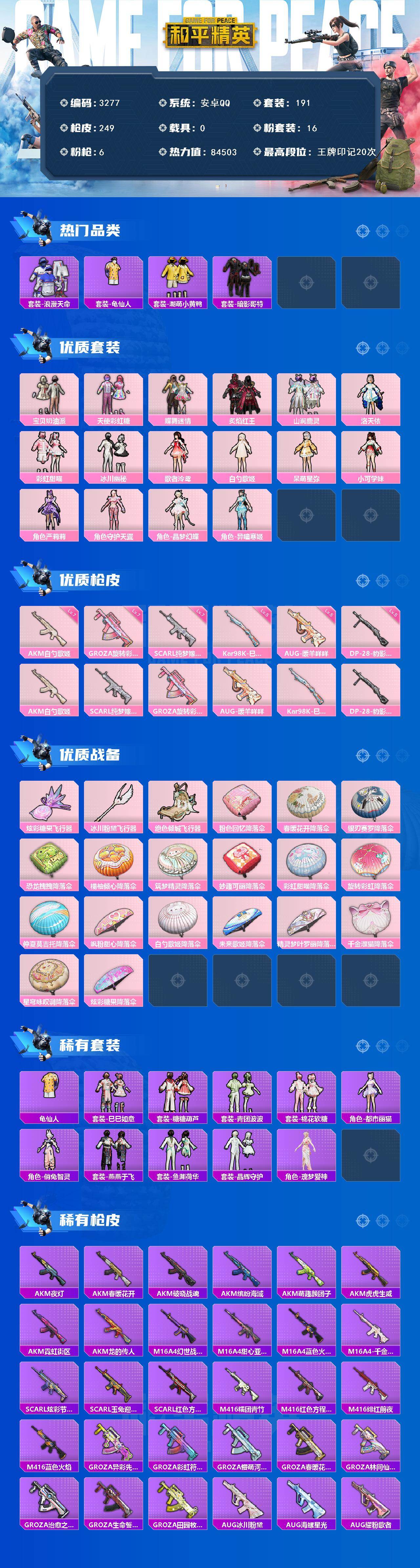安卓 手Q-16粉装-6特效枪-0载具-3粉色飞行器-84503热力值-20王牌印记-191套装-249枪皮