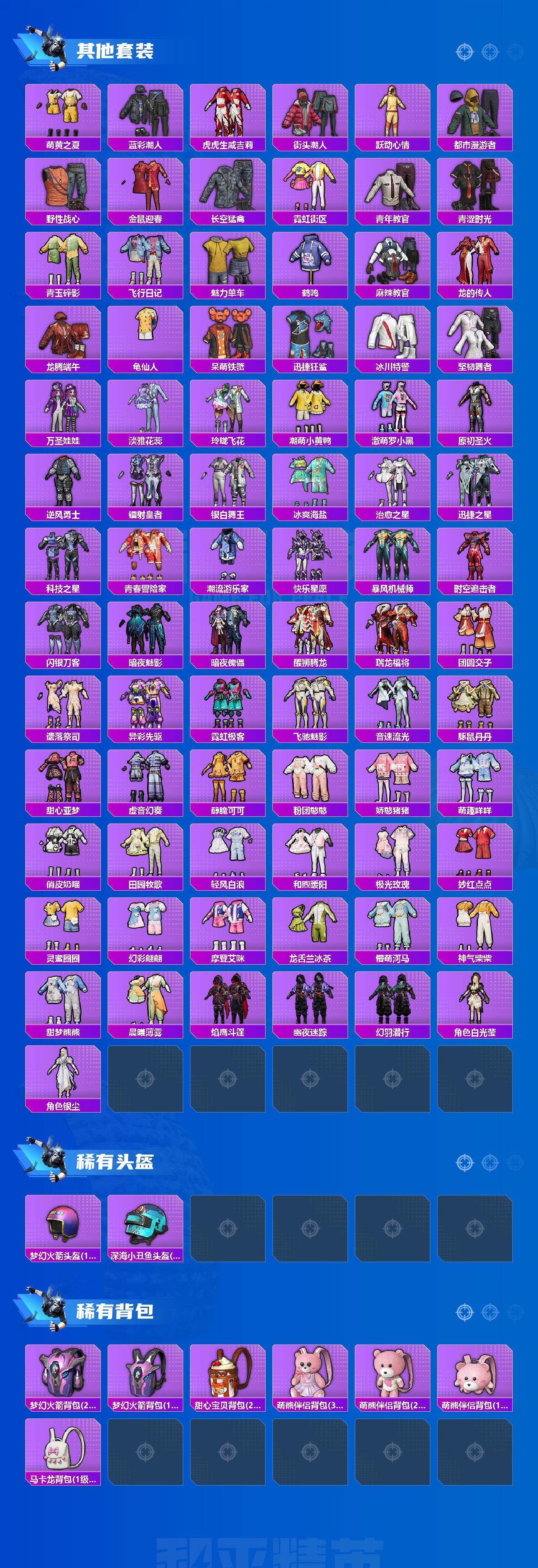 【粉色套装】:粉装-宝贝奶油派,粉装-天使彩虹糖,粉装-蝶舞迷情,粉装-炙焰红王,粉装-山涧鹿灵,角色-洛天依,粉装-彩虹甜喵,粉装-冰川幽秘,角色-歌者泠鸢,角色-白勺歌姬,角色-呆萌星弥,角色-小可学妹,角色-严莉莉,角色-守护天翼,角色-晶梦幻蝶,角色-异瞳寒姬